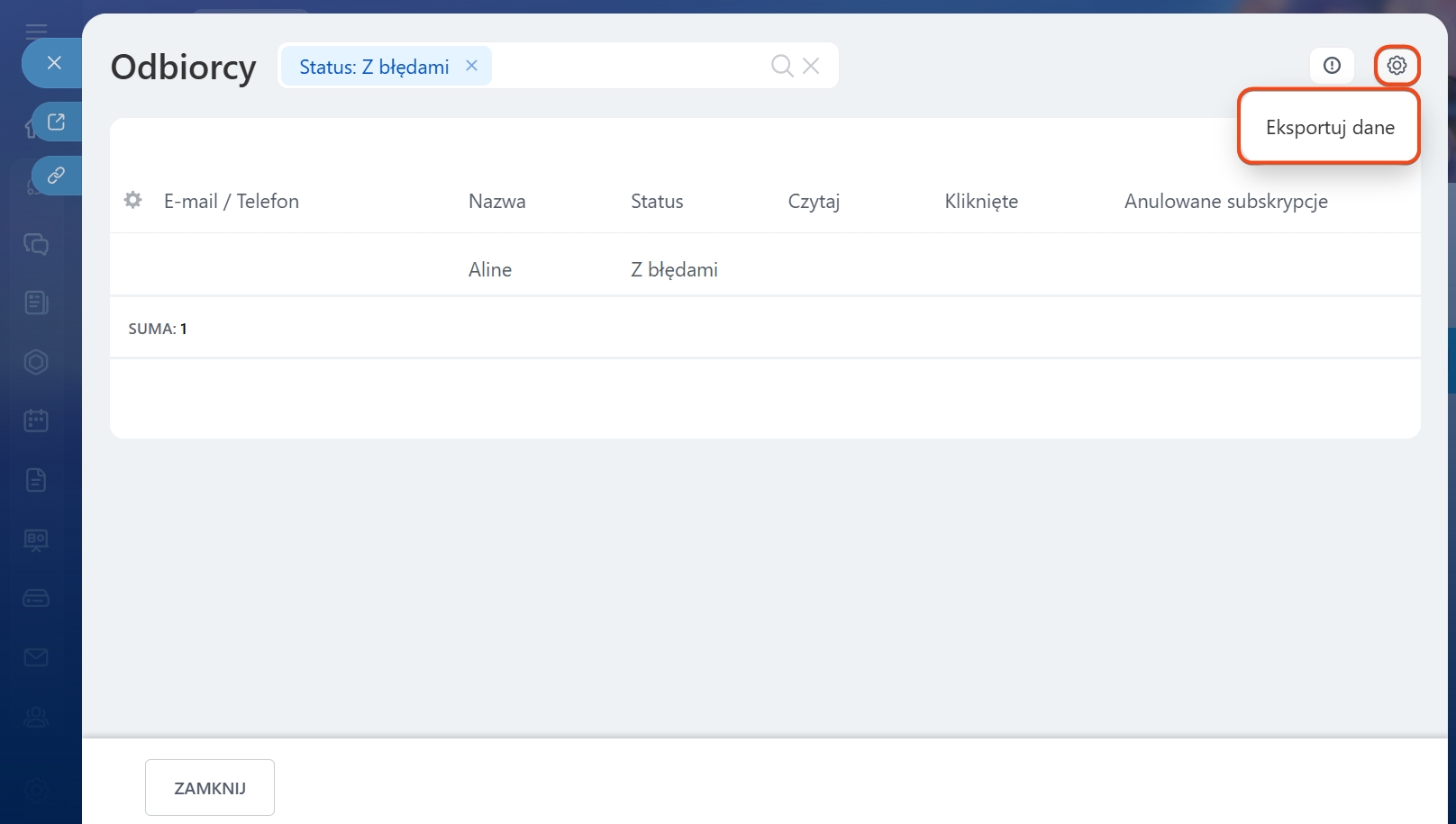 Zobaczysz listę odbiorców oznaczonych statusem Z błędami. Aby ją wyeksportować, kliknij przycisk koła zębatego w prawym górnym rogu i wybierz Eksportuj dane.