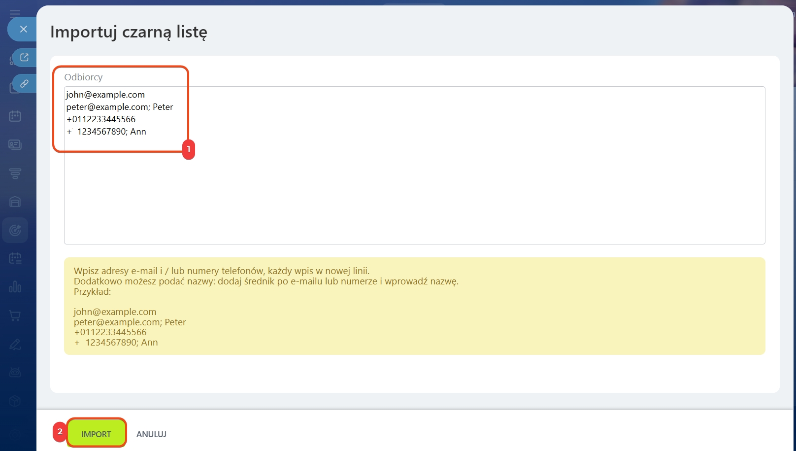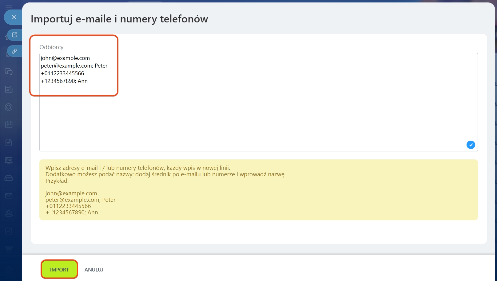Wklej adresy e-mail z zapisanych plików i kliknij Import.