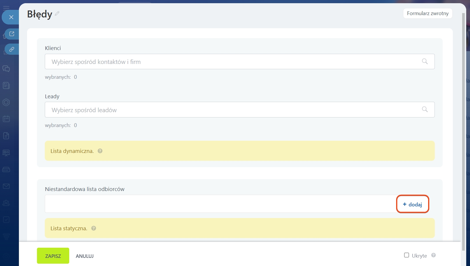 W sekcji Niestandardowa lista odbiorców kliknij przycisk Dodaj.