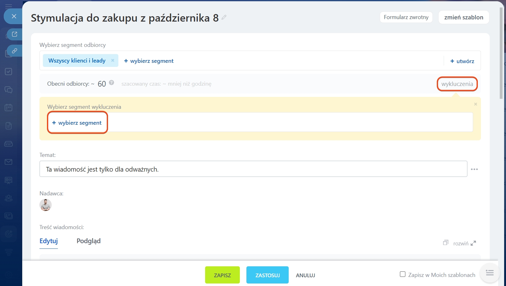 Podczas tworzenia nowej kampanii e-mailowej kliknij Wykluczenia i wybierz utworzony segment.