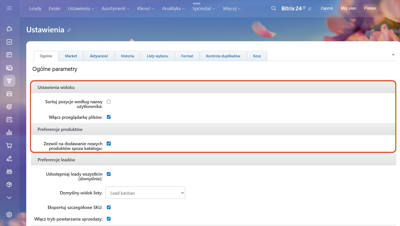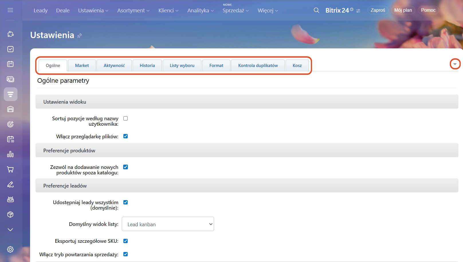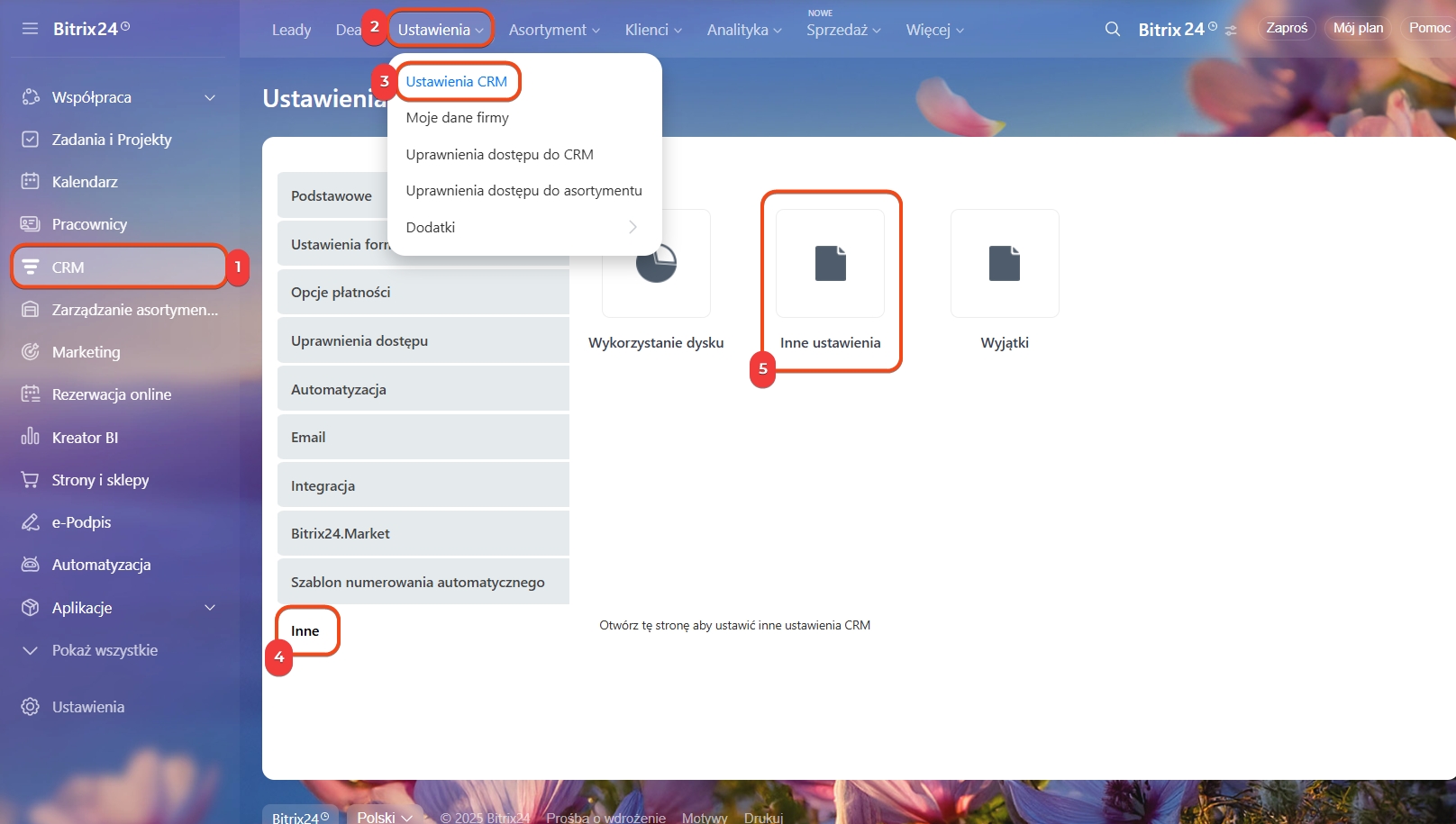 Inne ustawienia to rozbudowana sekcja w CRM, w której możesz skonfigurować różne parametry, takie jak format nazwy klienta, tworzenie powtarzalnych leadów i inne.
