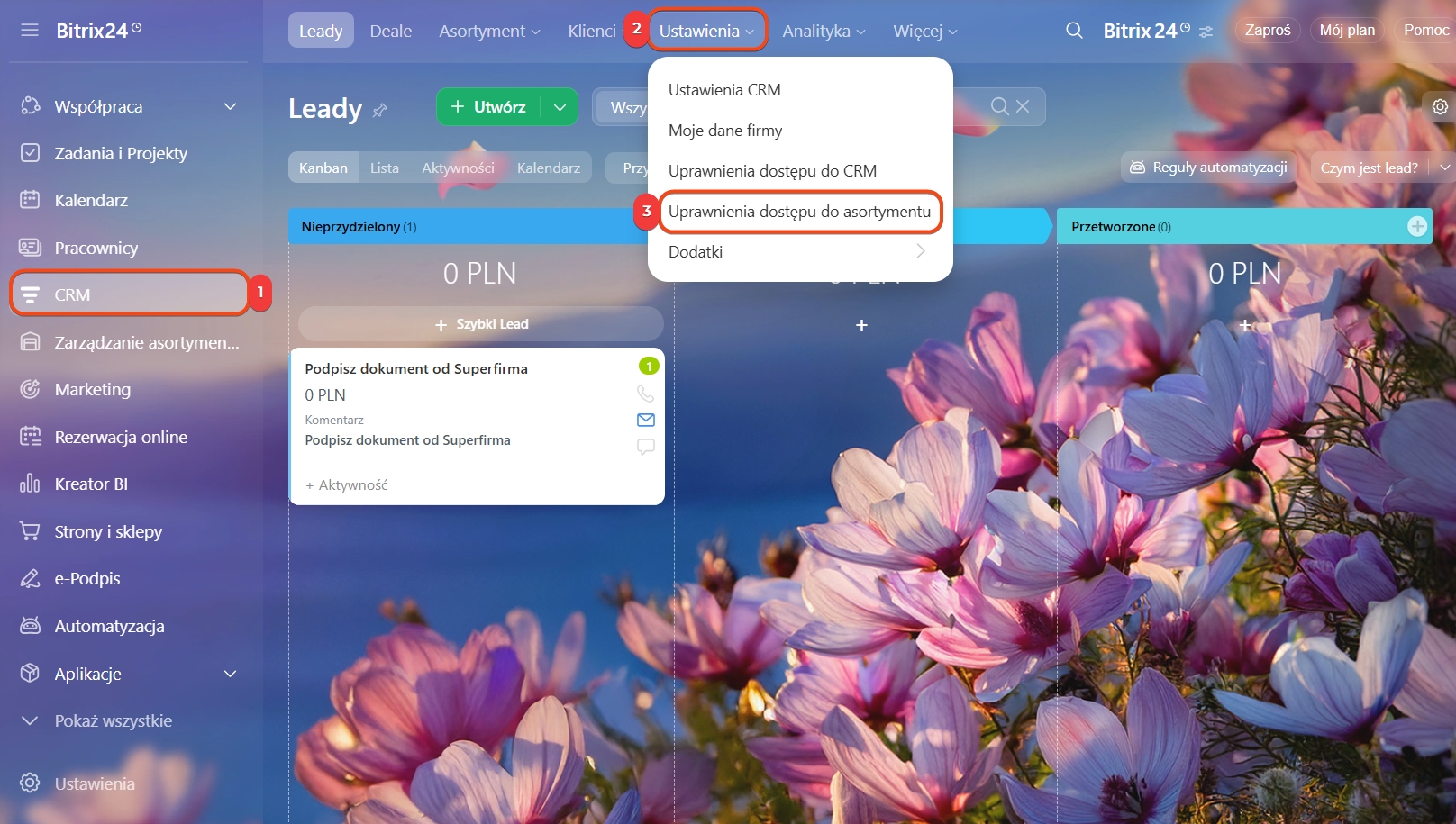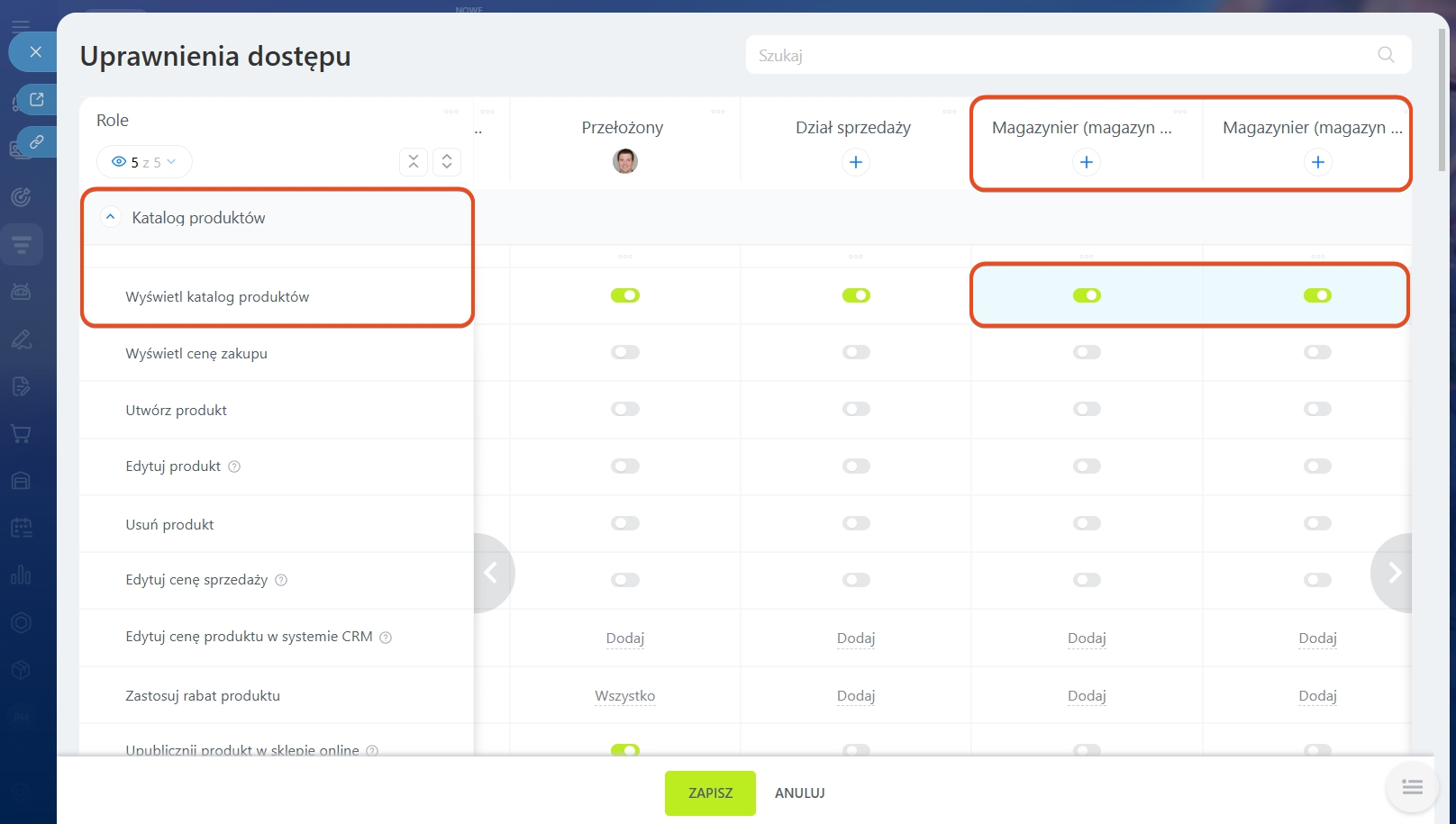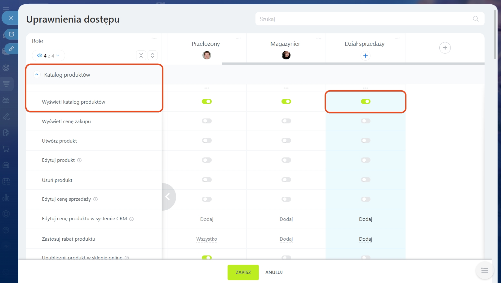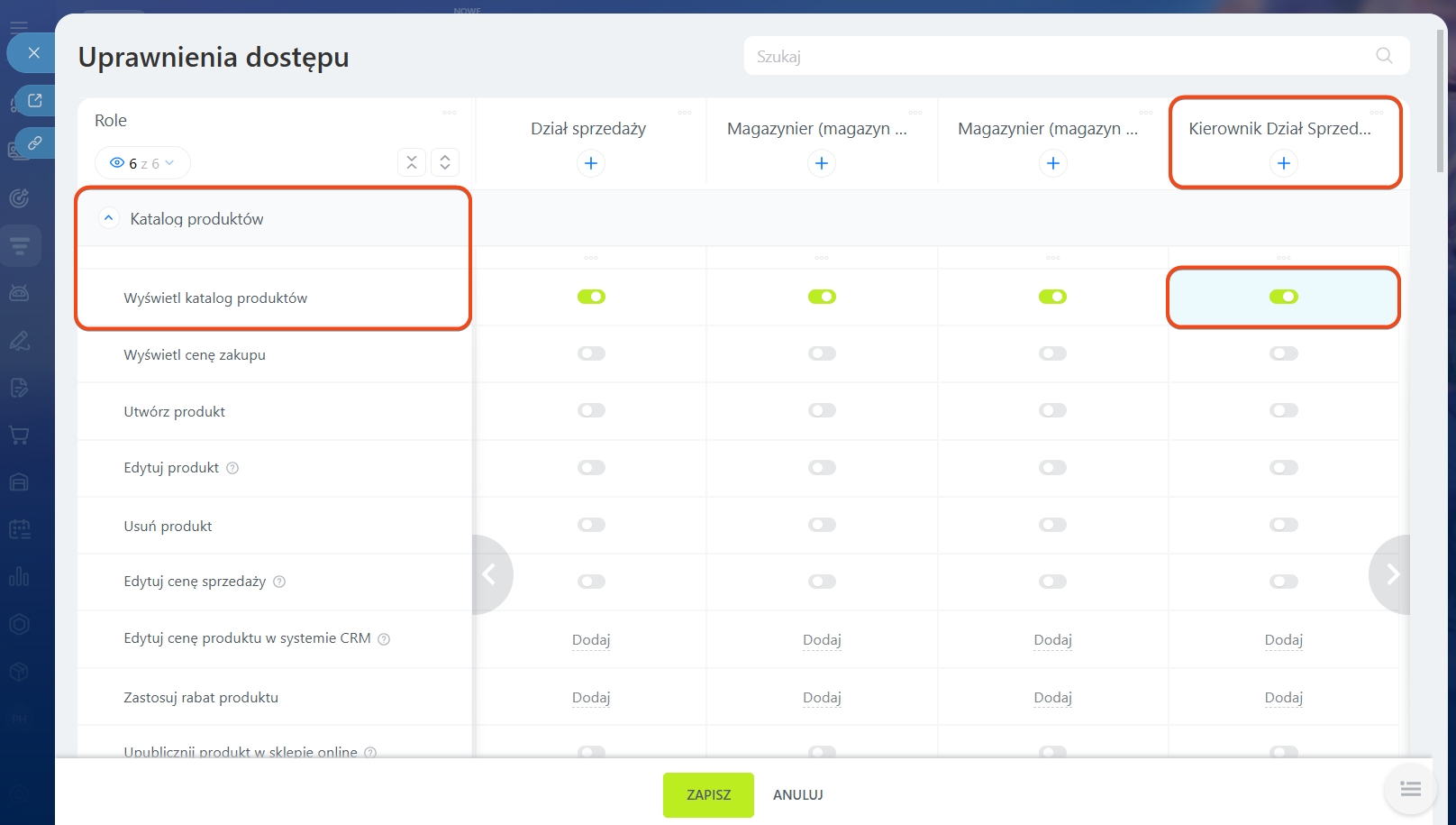 Otwórz sekcję CRM > Ustawienia > Uprawnienia dostępu do asortymentu. Zarządzanie Asortymentem działa razem z katalogiem — upewnij się, że pracownicy mają dostęp do katalogu produktów i CRM.