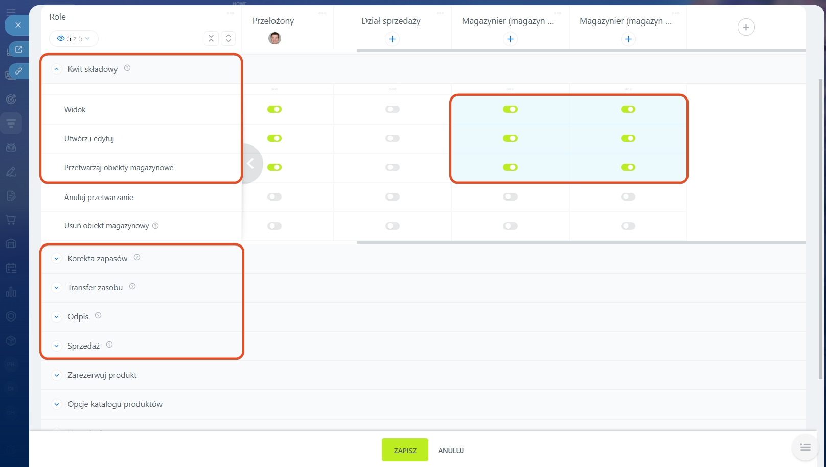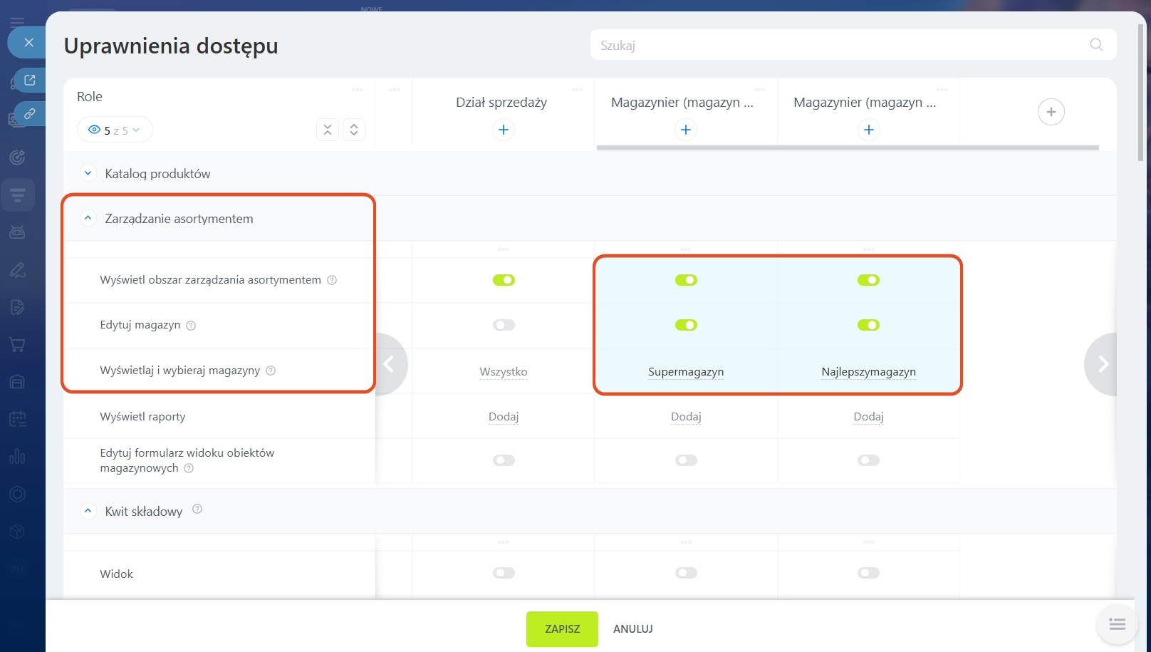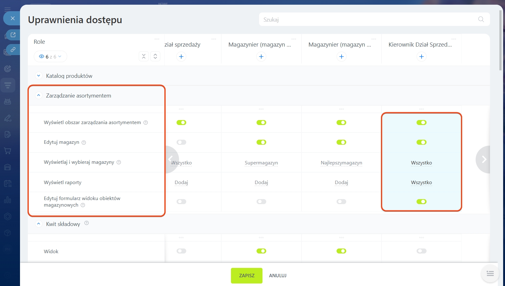 3. Stwórz rolę „Kierownik działu sprzedaży” i przyznaj uprawnienia: Wyświetl katalog produktów, Wyświetl obszar Zarządzania Asortymentem, Wyświetl raporty, Wyświetlaj i wybieraj magazyny. Wybierz wszystkie magazyny, aby kierownik widział wszystkie informacje o stanach i przepływie produktów. Dodatkowo skonfiguruj uprawnienia Edytuj magazyn i Edytuj formularz widoku obiektów magazynowych. Dla dokumentów magazynowych dodaj możliwość Anuluj przetwarzanie. Dzięki temu kierownik będzie mógł poprawiać błędy, kontrolować zarządzanie i utrzymywać jednolity format dokumentów.