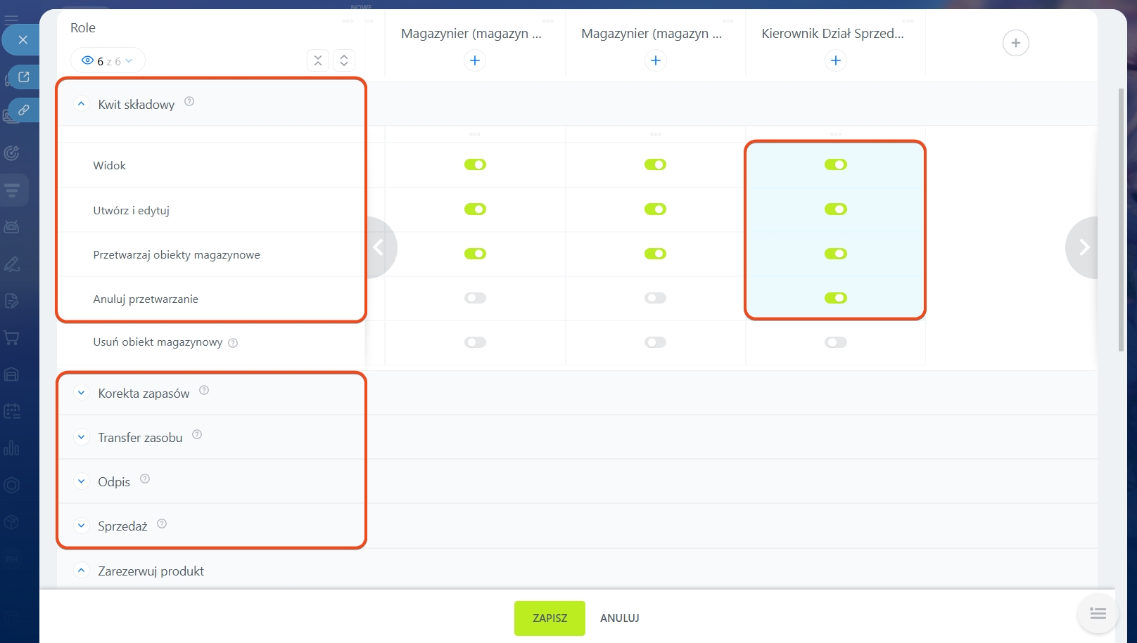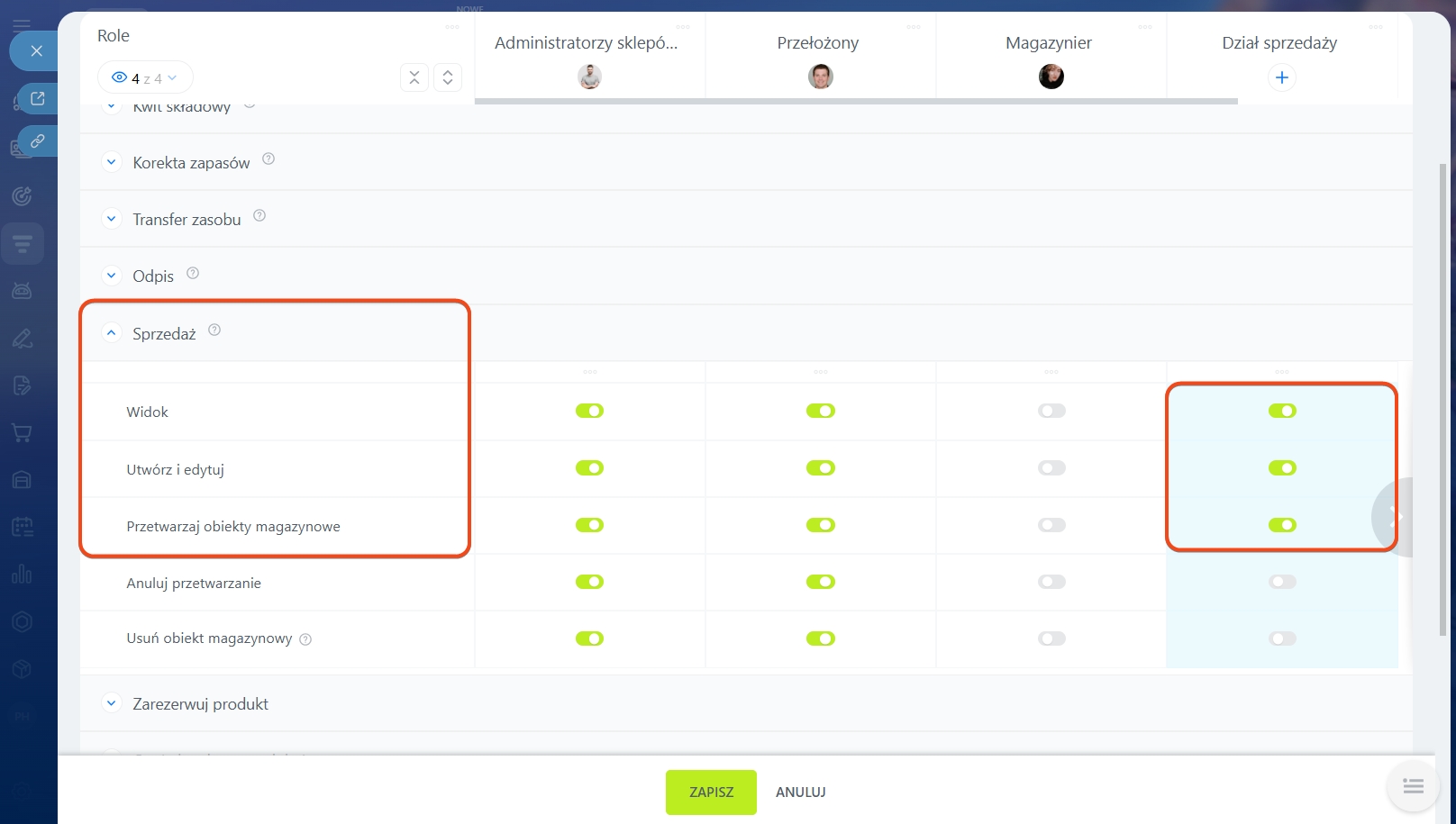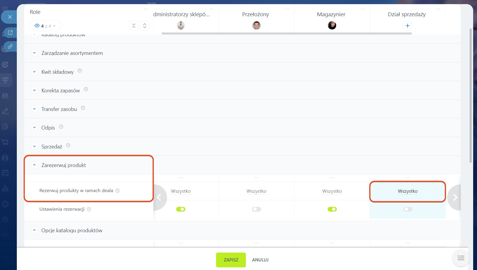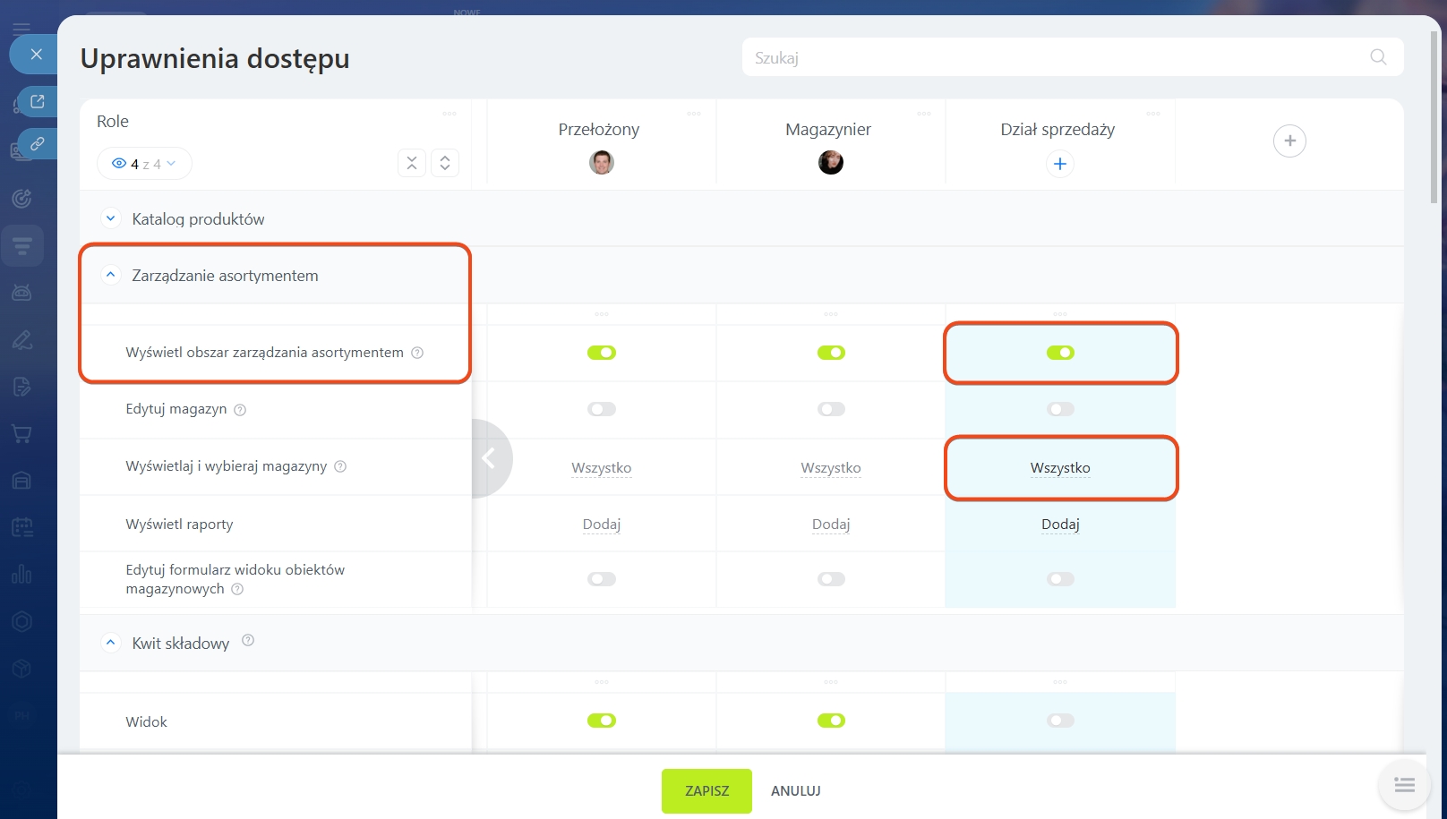 1. Stwórz rolę „Dział sprzedaży” i przyznaj dla niej uprawnienia: Wyświetl katalog produktów, Wyświetl obszar Zarządzania Asortymentem, Wyświetlaj i wybieraj magazyny, Rezerwuj produkty w ramach deala. Dla dokumentu „Sprzedaż” włącz: Widok, Utwórz i edytuj, Przetwarzaj obiekty magazynowe. Dzięki temu menedżerowie działu sprzedaży będą mogli wybrać magazyn w ramach deala, zarezerwować produkt i zrealizować wysyłkę.