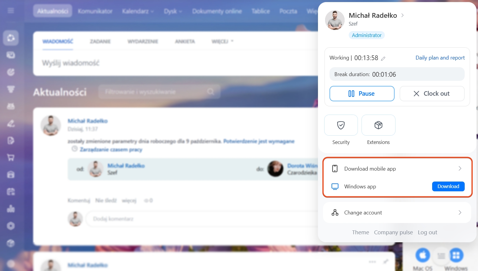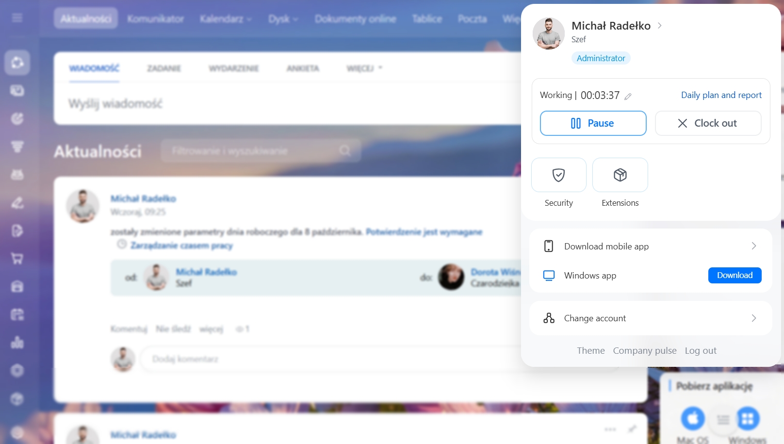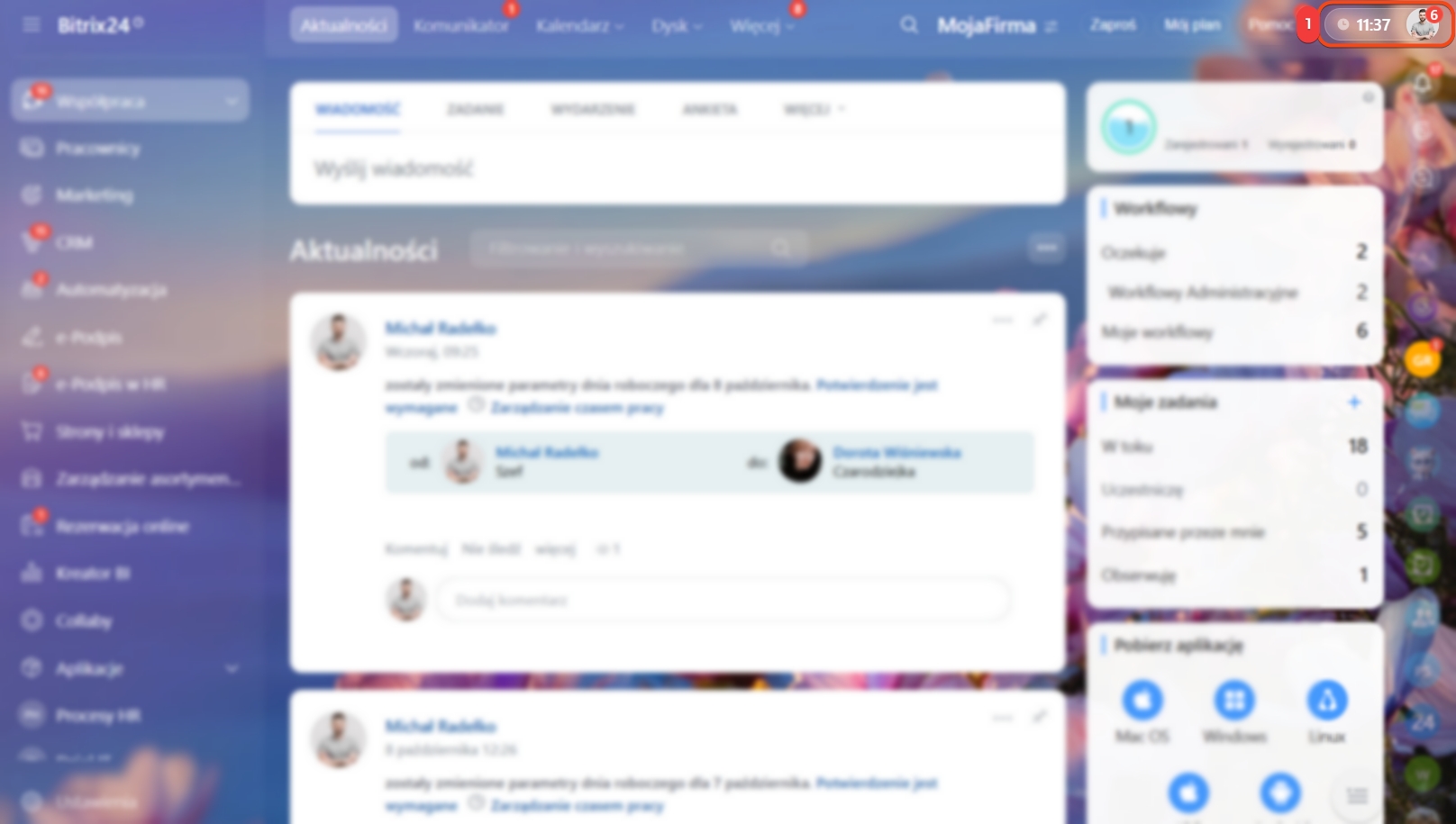Pobierz Komunikator Bitrix24 — aplikację do komunikacji wewnątrz firmy. W aplikacji dostępne są czaty, wideorozmowy, CoPilot oraz inne narzędzia Bitrix24.
