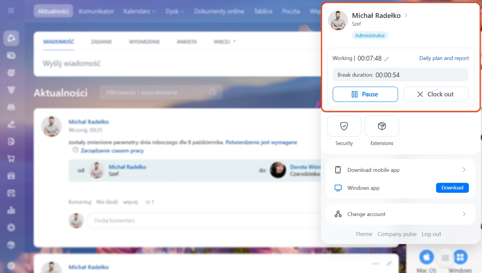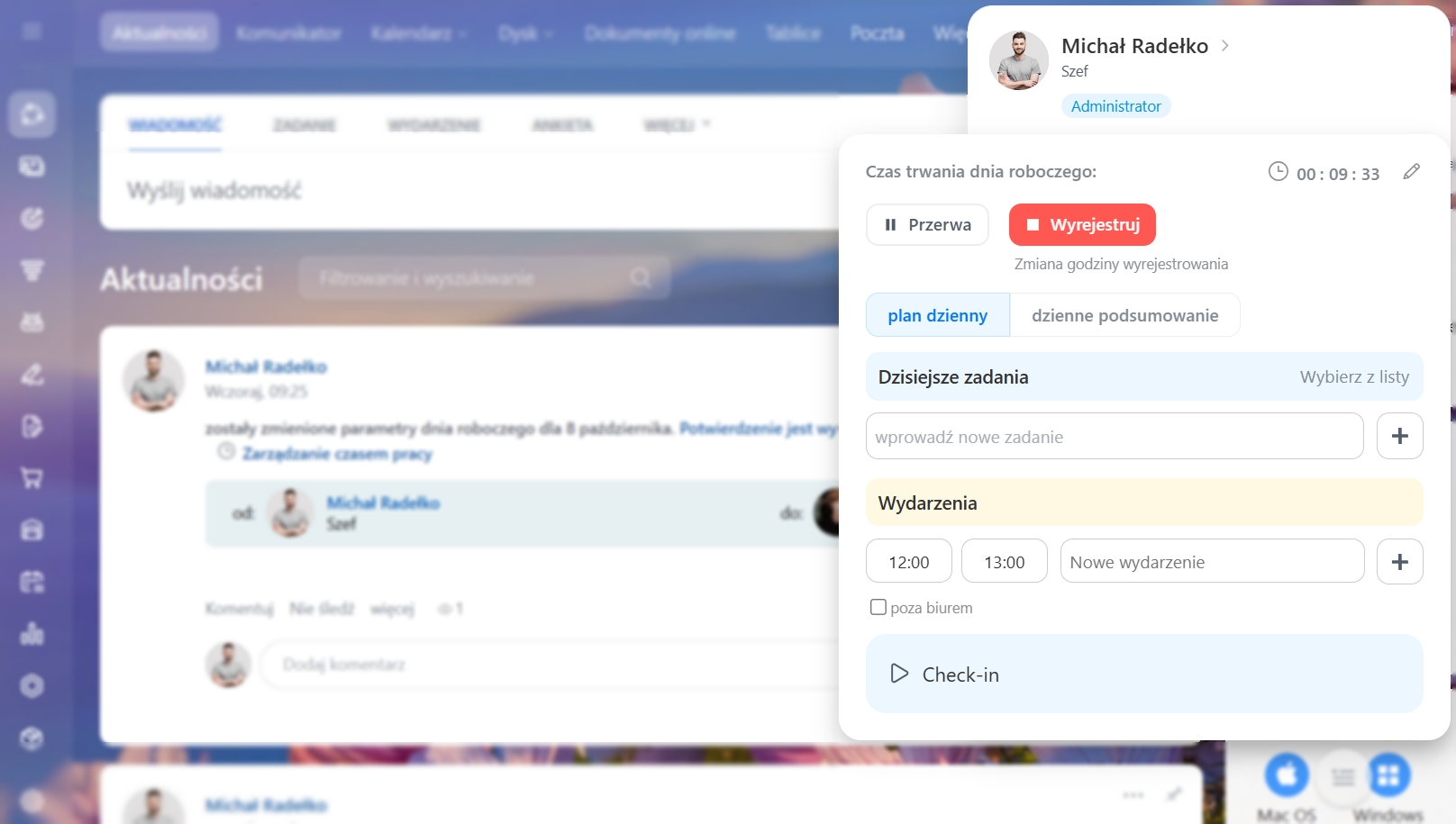 Rozpocznij i zakończ dzień pracy — rejestruj rozpoczęcie i zakończenie dnia pracy, przerwy oraz nieobecności.