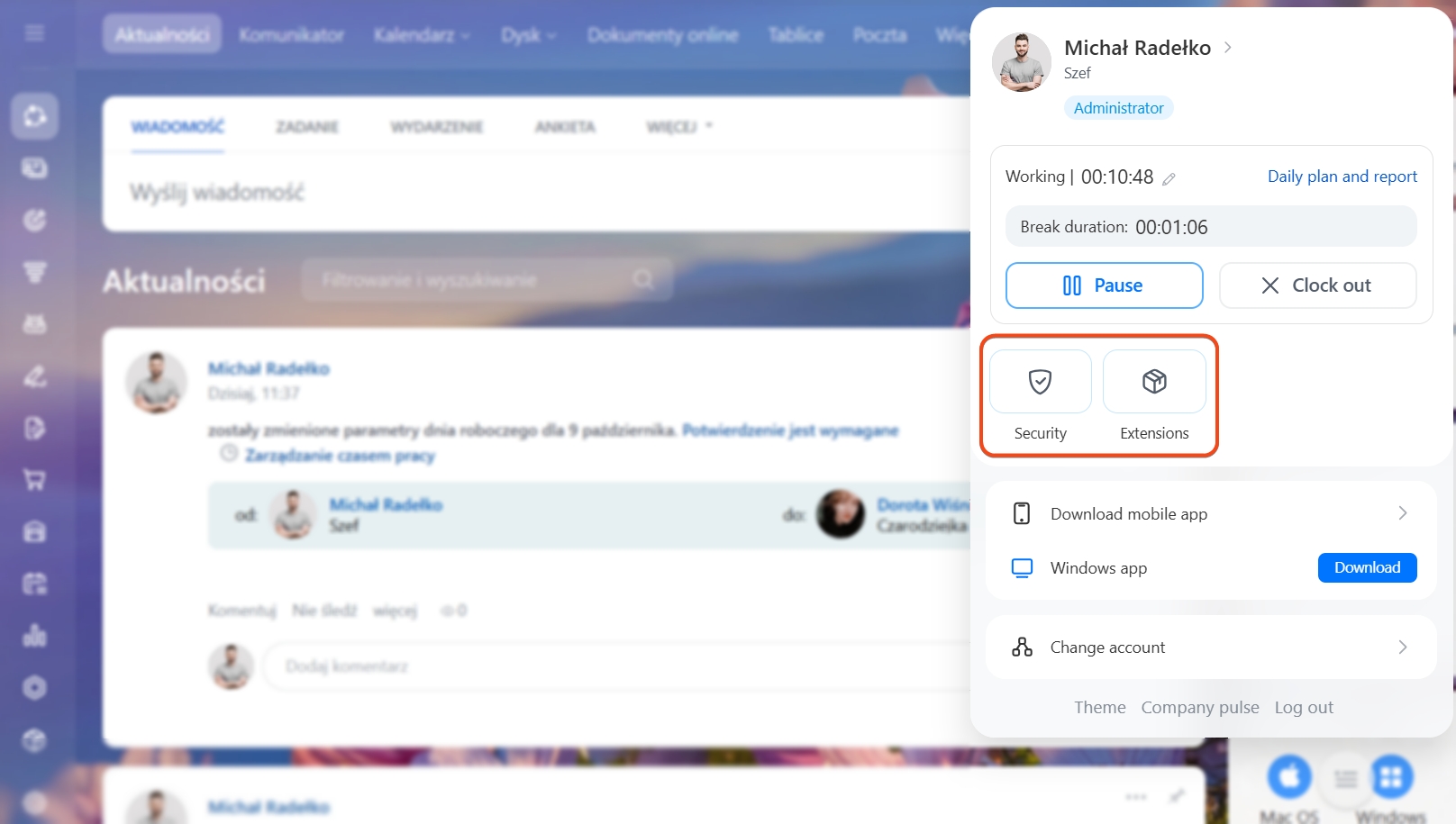 Widżet pracownika w Bitrix24 to wygodne menu do zarządzania kontem i ustawieniami. Możesz szybko uzyskać dostęp do ważnych danych i ustawień: zmienić hasło, sprawdzić pozostałe dni urlopu, wysłać elektroniczne dokumenty kadrowe i wiele więcej.