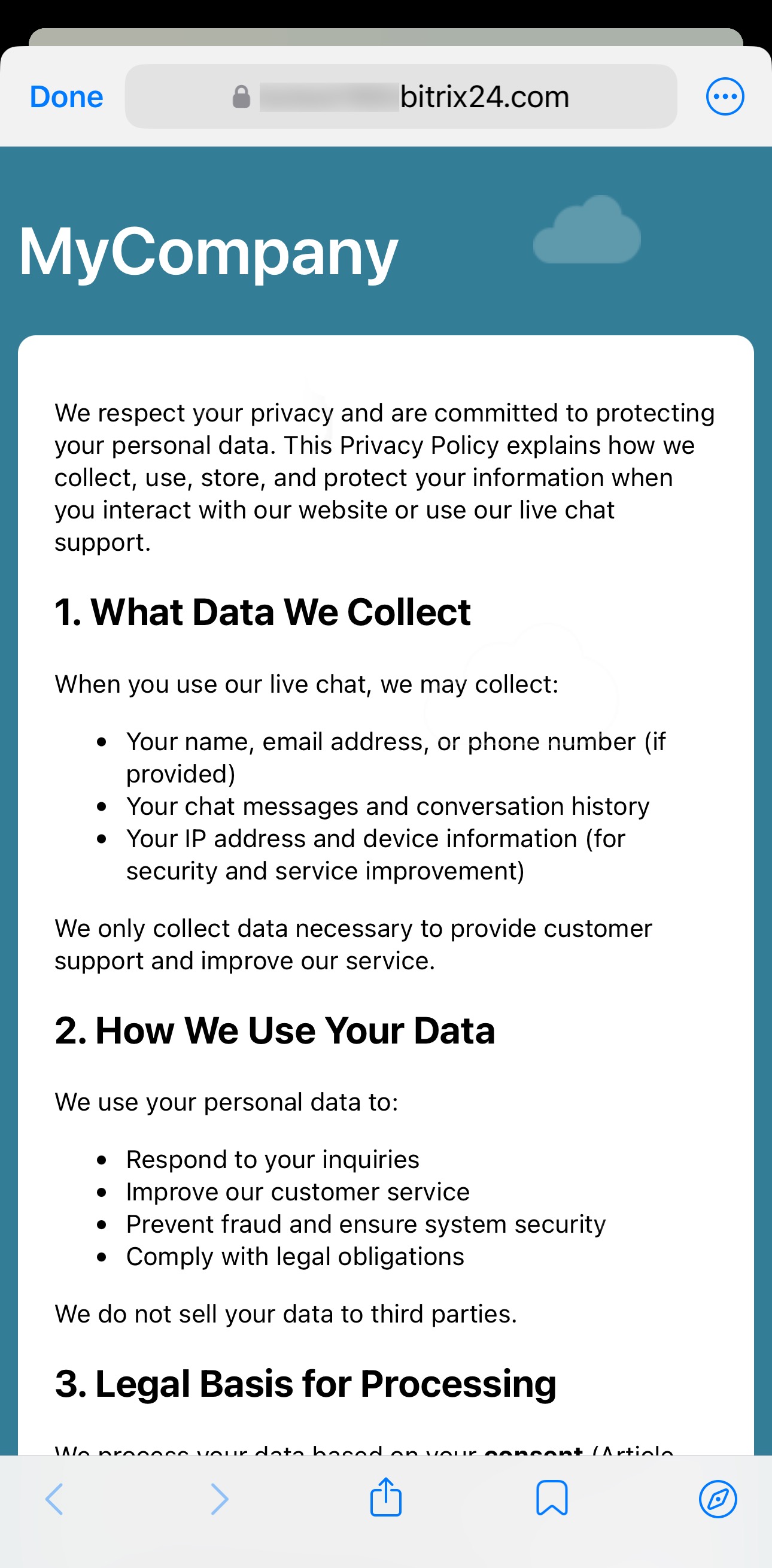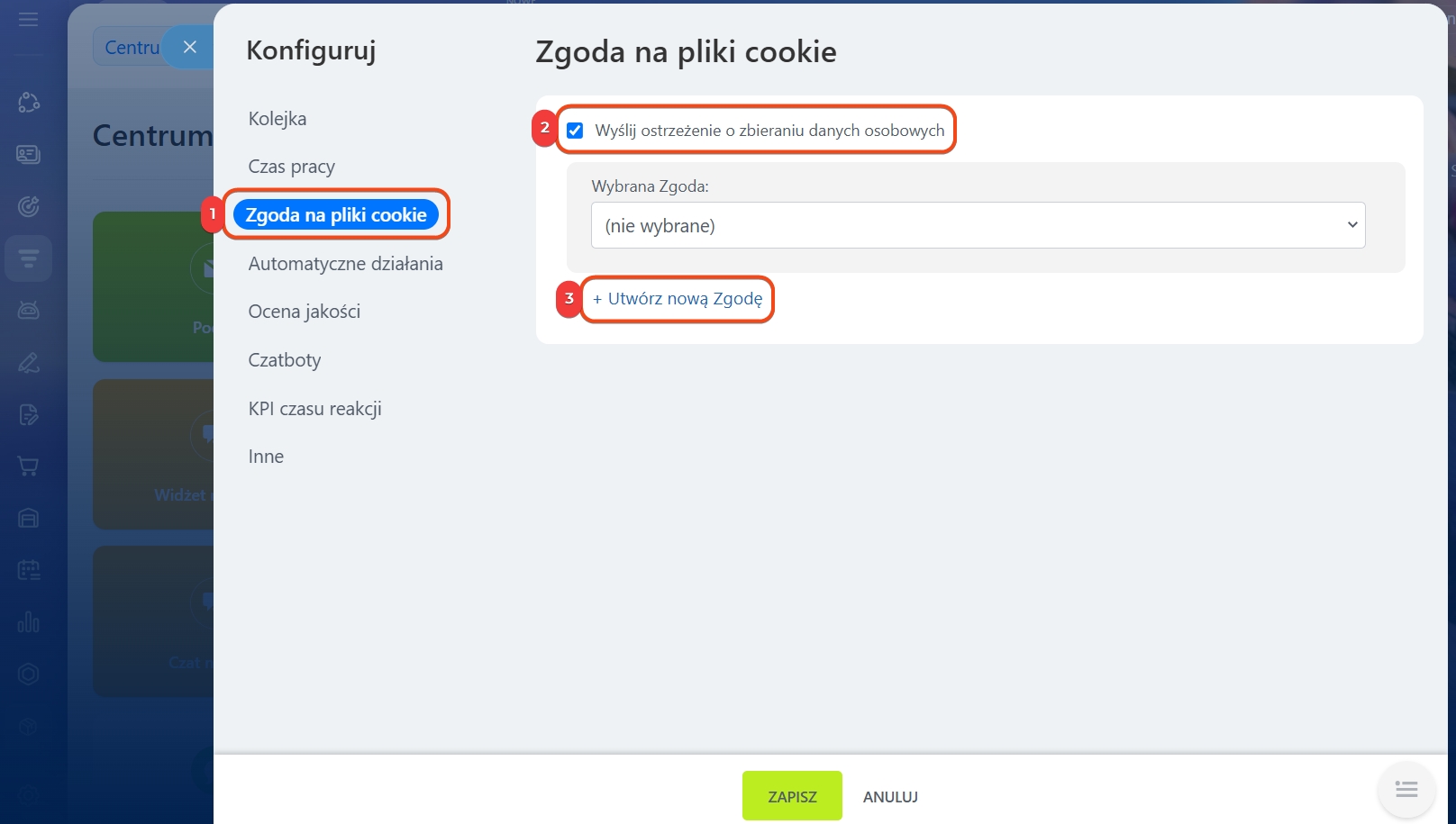 W wielu krajach, w tym w Unii Europejskiej zgodnie z RODO, firmy są prawnie zobowiązane do uzyskania zgody klienta przed zbieraniem lub wykorzystywaniem danych osobowych. W Bitrix24 możesz automatycznie poprosić o taką zgodę podczas komunikacji przez otwarte kanały, takie jak czat na żywo czy komunikatory.