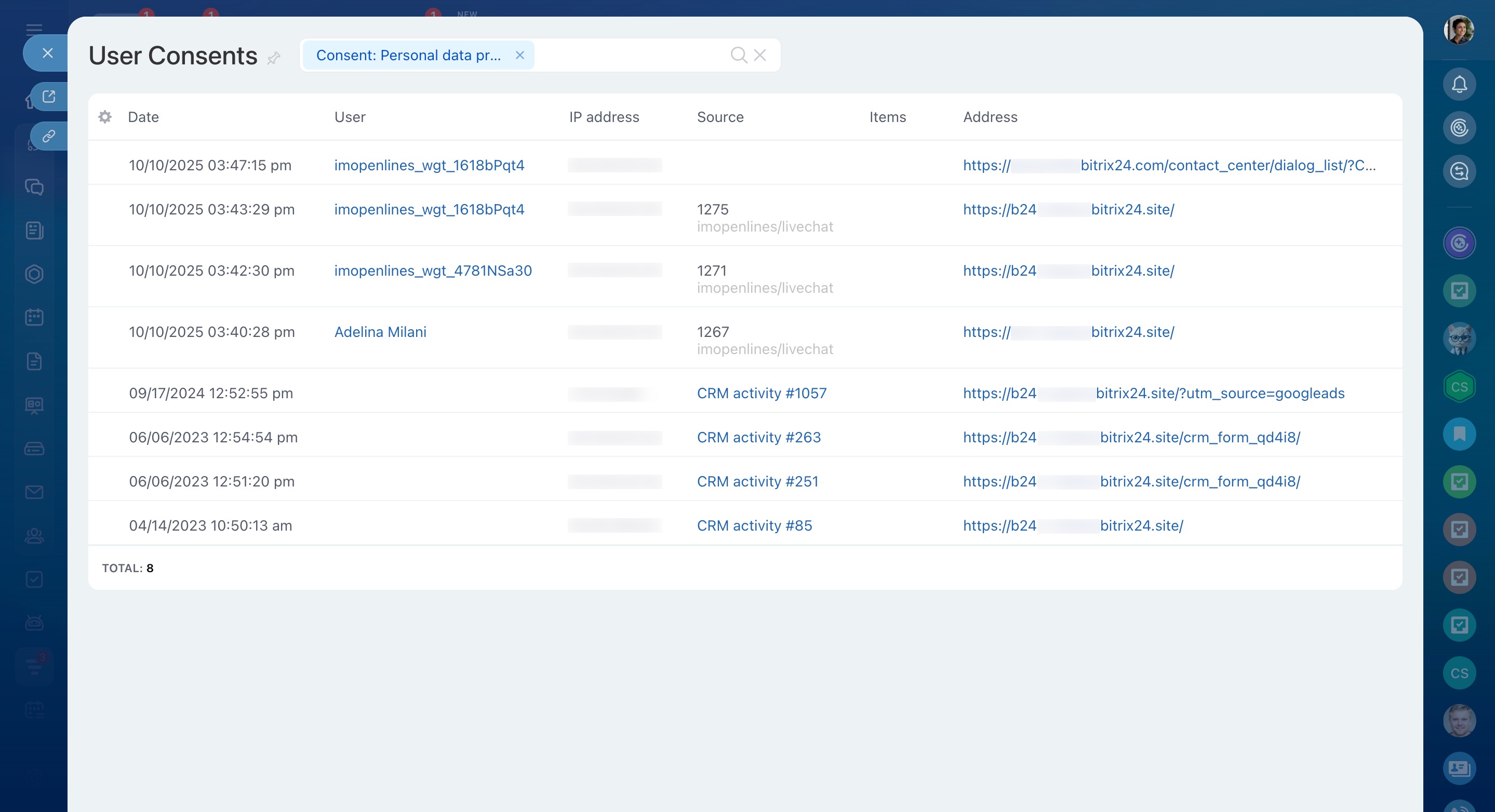 - W Bitrix24 możesz automatycznie prosić o zgodę na przetwarzanie danych przez komunikację w otwartych kanałach, takich jak czat na żywo czy komunikatory.