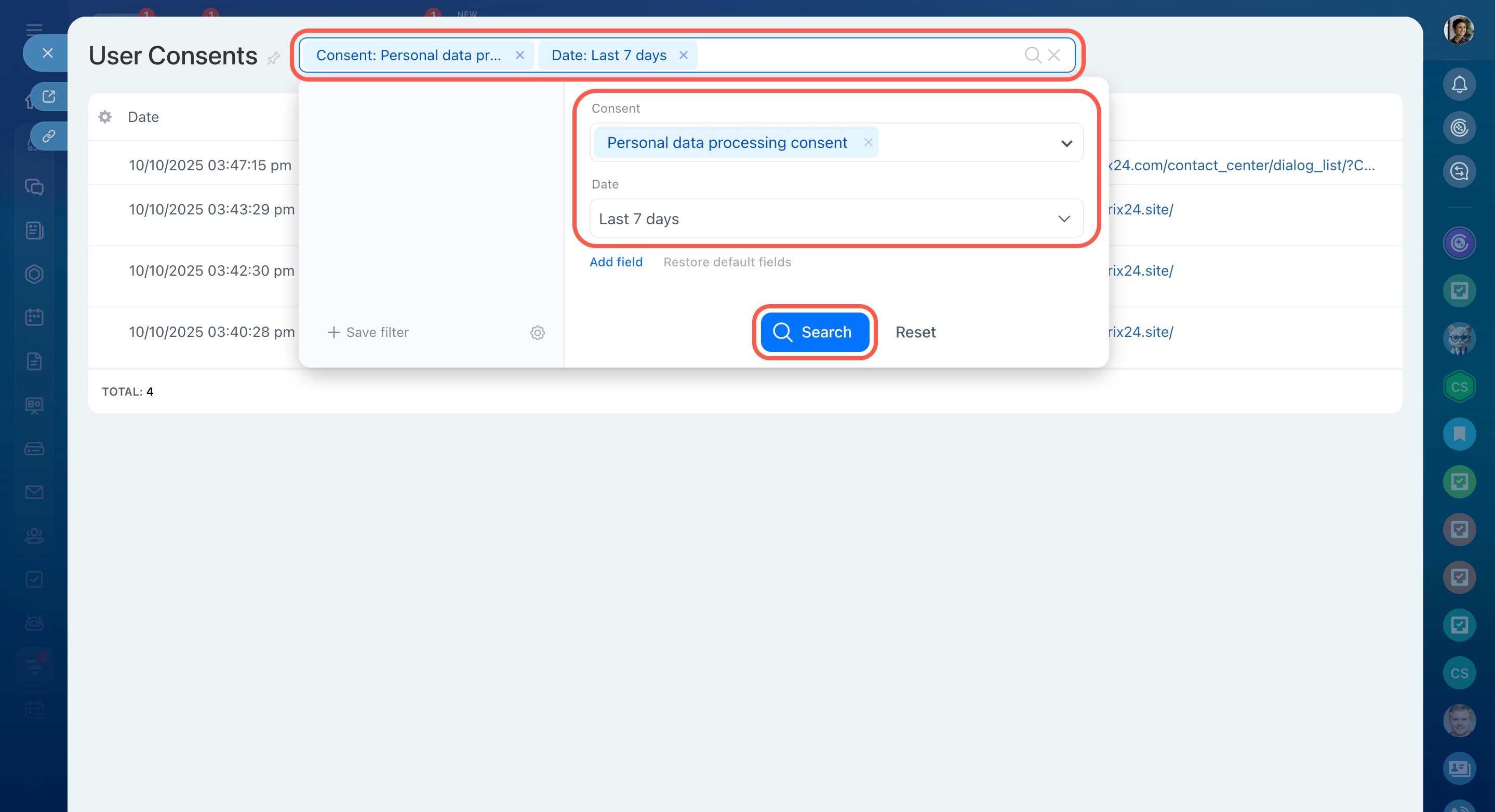 Aby znaleźć konkretne zapisy, użyj filtrów. Na przykład możesz wyświetlić wszystkie zgody uzyskane w ciągu ostatniego tygodnia.