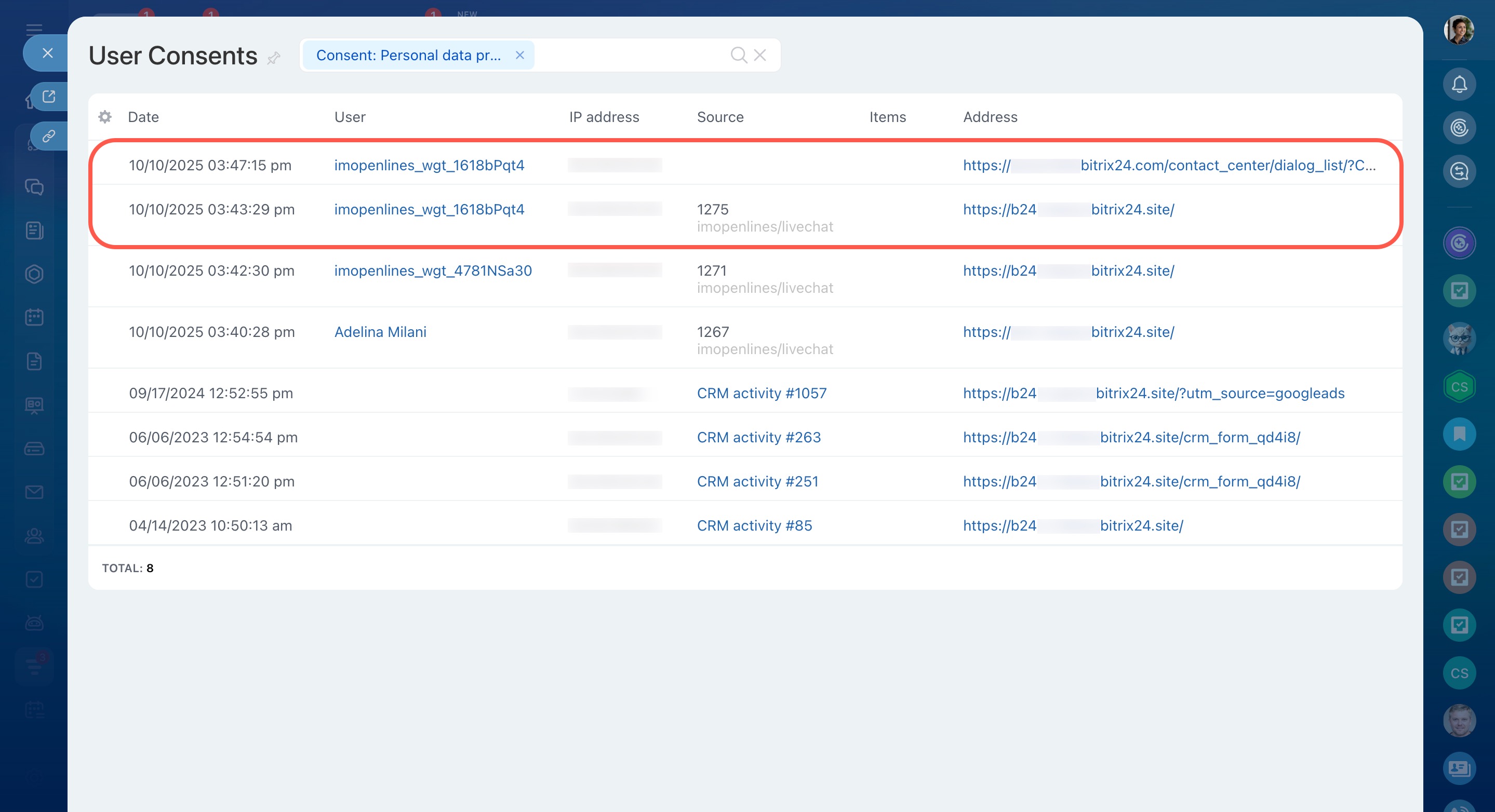 Lista będzie zawierać dwa rekordy zgody klienta. Pierwszy pokaże adres URL strony, na której klient potwierdził zgodę w kolumnie Adres, a drugi będzie powiązany z rozmową w Bitrix24.