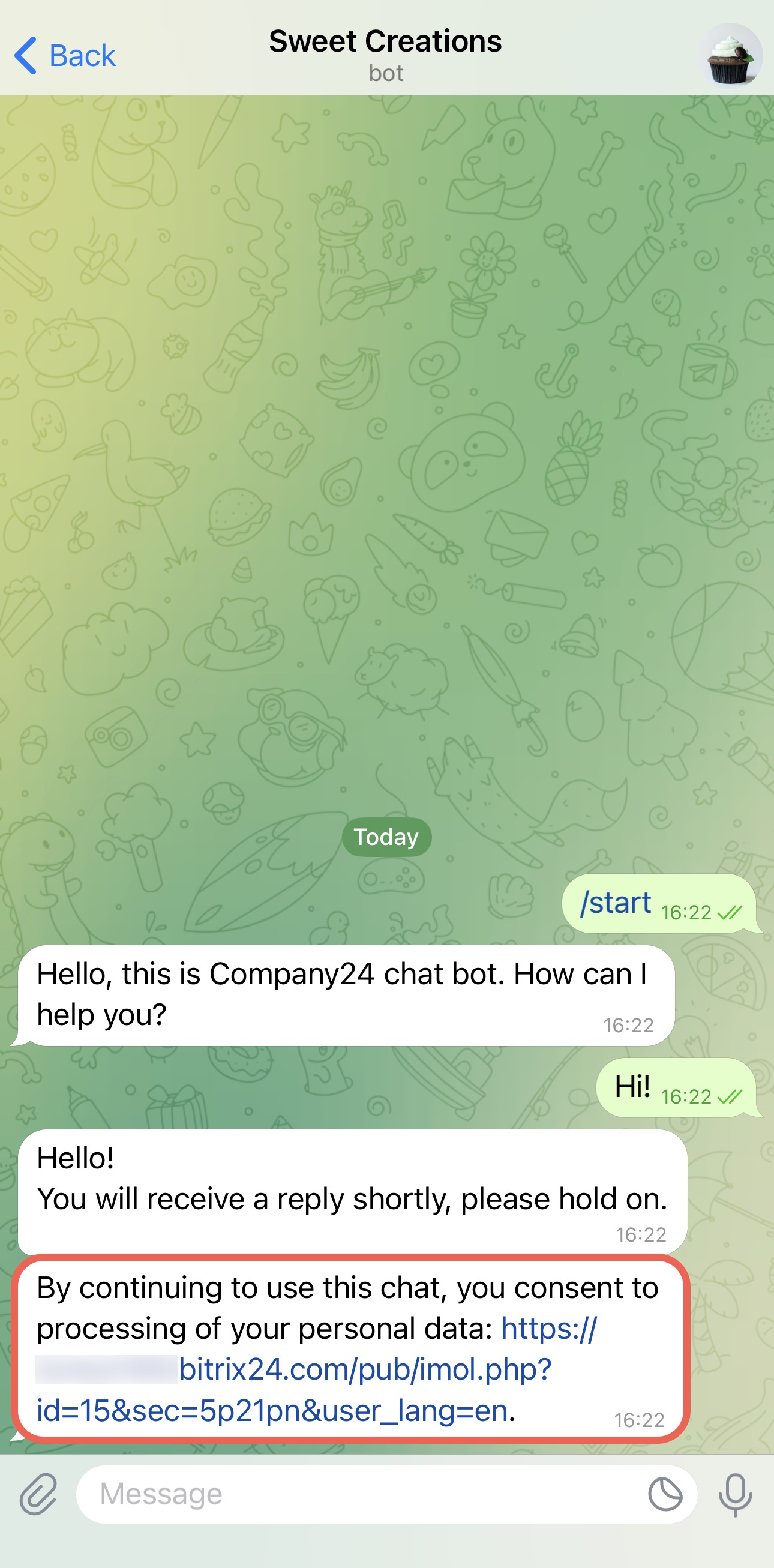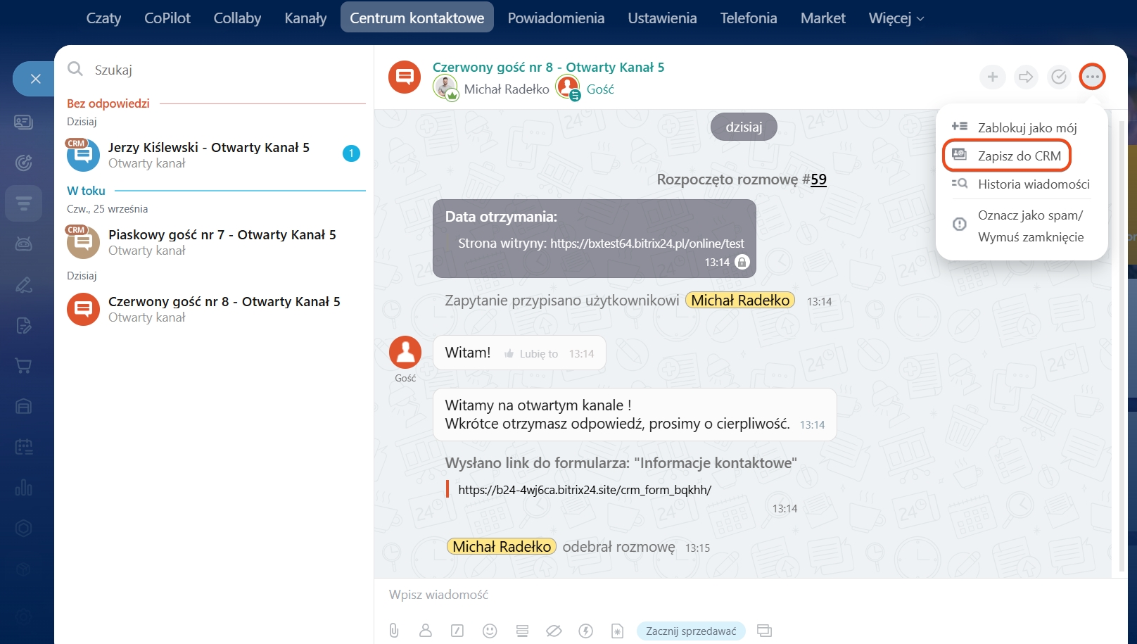 - Akceptuję: Bitrix24 rozpoczyna nową rozmowę, a zgoda klienta na przetwarzanie danych osobowych jest zapisywana w CRM.