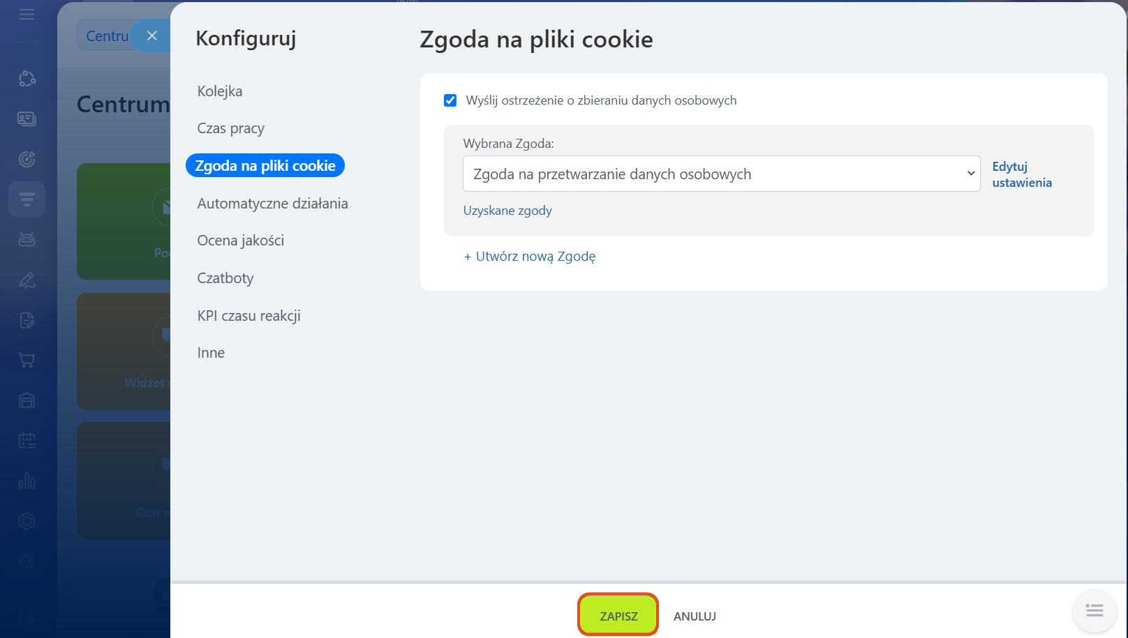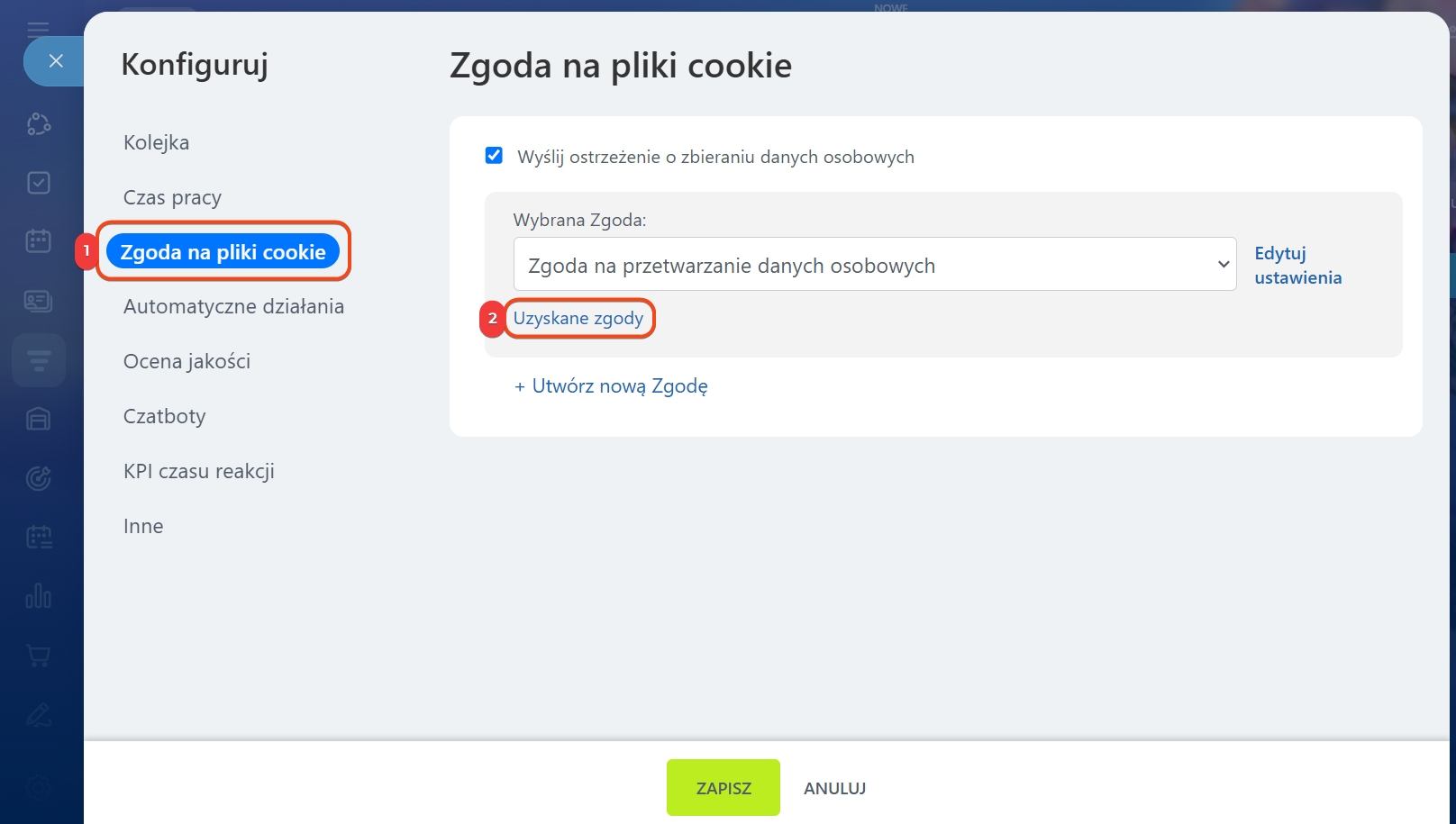 - Sposób potwierdzania zgody zależy od kanału komunikacji. W czacie na żywo klienci widzą tekst zgody i muszą kliknąć Akceptuję. W komunikatorach pojawia się ostrzeżenie, a jeśli klient wyśle wiadomość, zgoda jest uznawana za potwierdzoną.