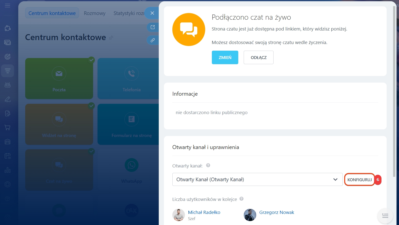 - Odrzucam: Wiadomość nie zostanie wysłana, a klient nie będzie mógł rozpocząć czatu. Ta odmowa nie jest zapisywana w CRM.