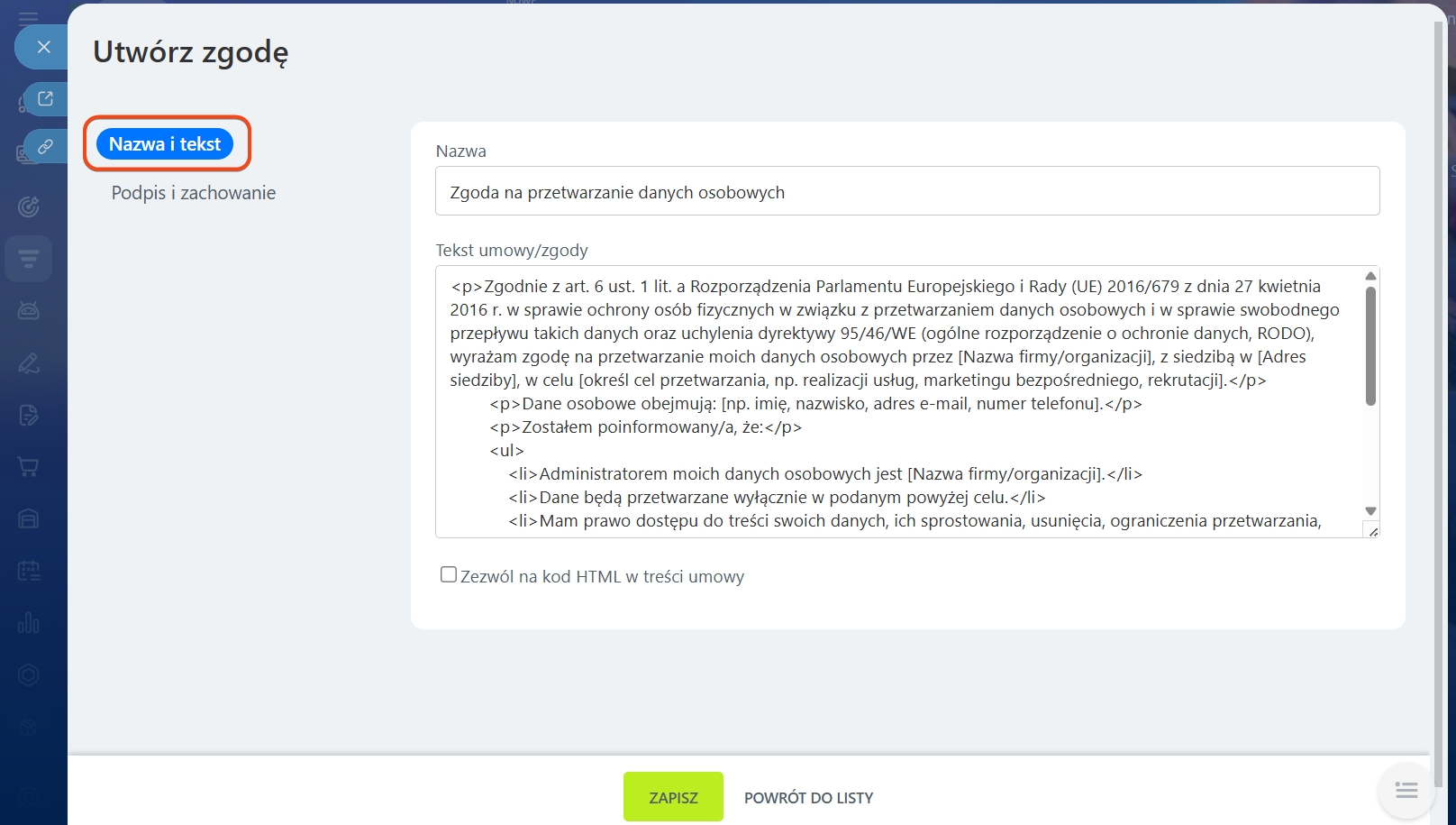 - Zezwól na HTML w tekście zgody: Włącz tę opcję, jeśli chcesz sformatować tekst za pomocą HTML.