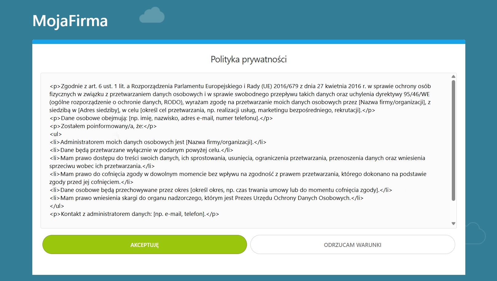 - Data: Kiedy klient potwierdził swoją zgodę.