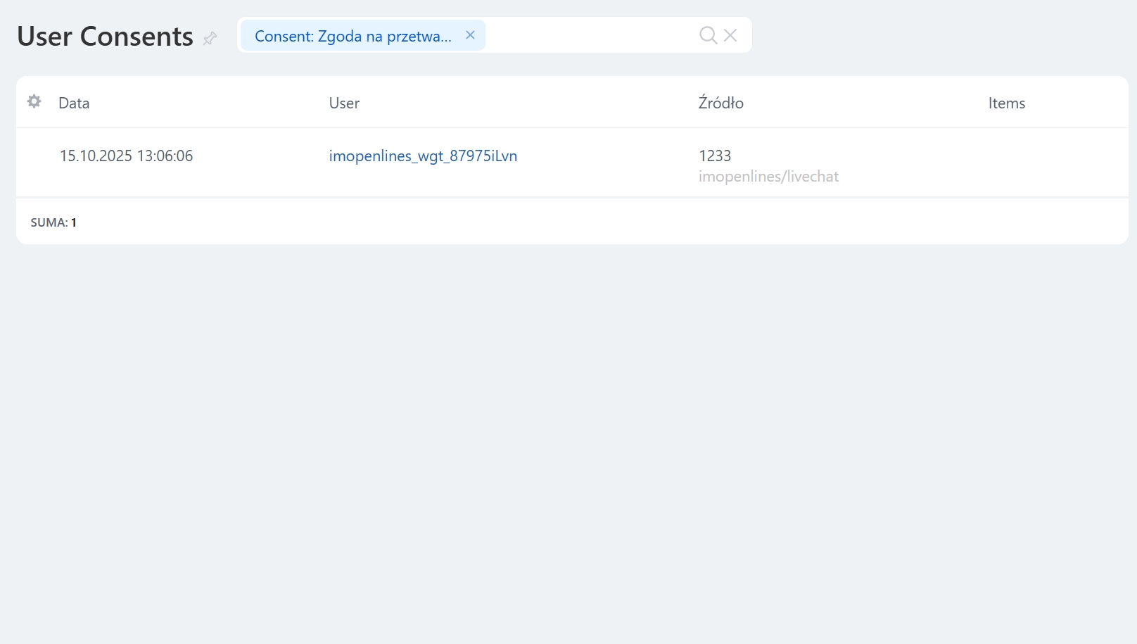 - Lista pokazuje datę zgody, IP klienta, źródło oraz stronę, na której zgoda została potwierdzona. Możesz filtrować wyniki, ale tych danych nie można usunąć.