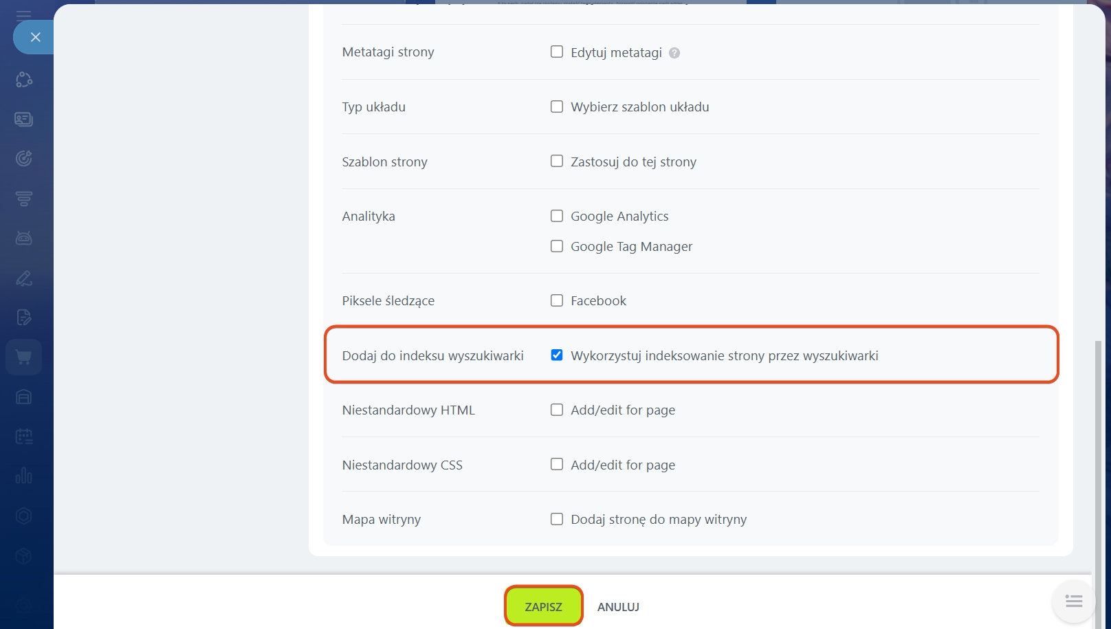 W sekcji Dodaj do indeksu wyszukiwarki włącz opcję Zaindeksuj stronę przez wyszukiwarki. Kliknij Zapisz.