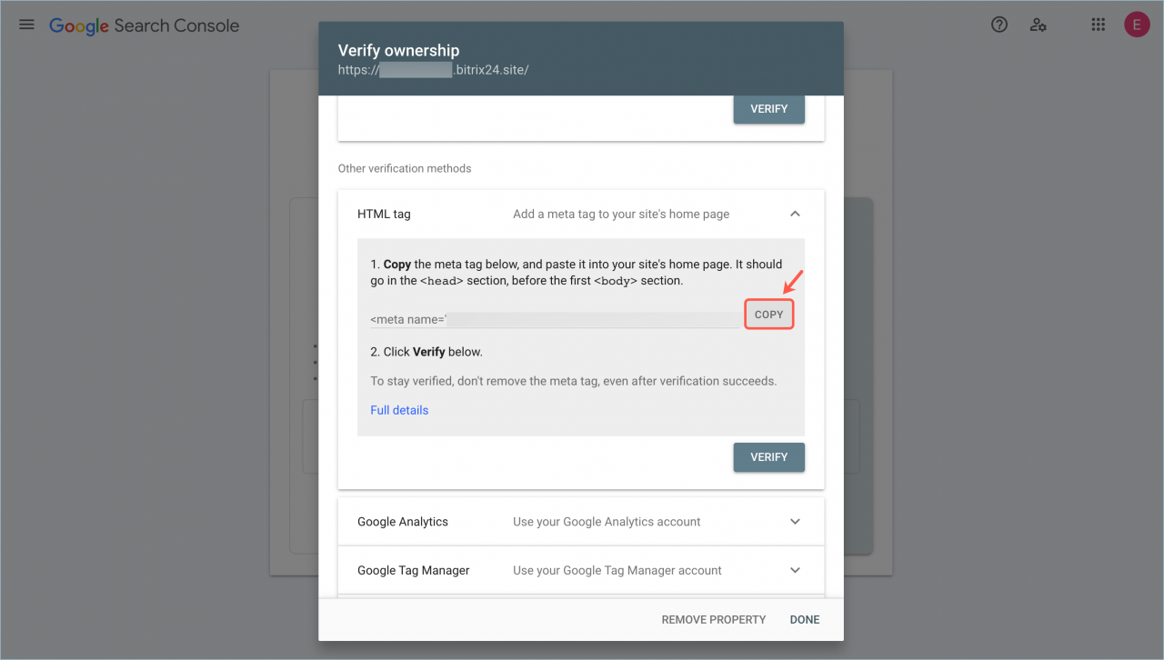 Wybierz opcję Tag HTML i skopiuj meta tag.