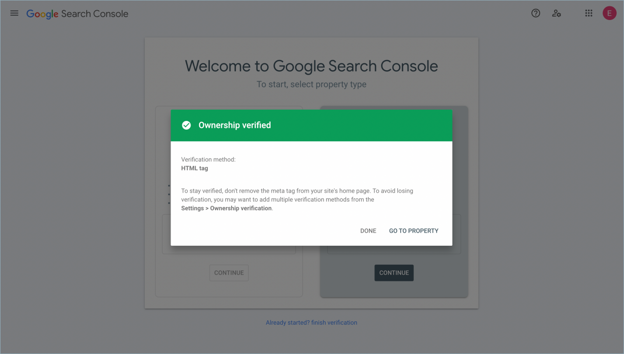 Gotowe! Twoja własność została zweryfikowana, a Twoja strona jest zaindeksowana przez Google.