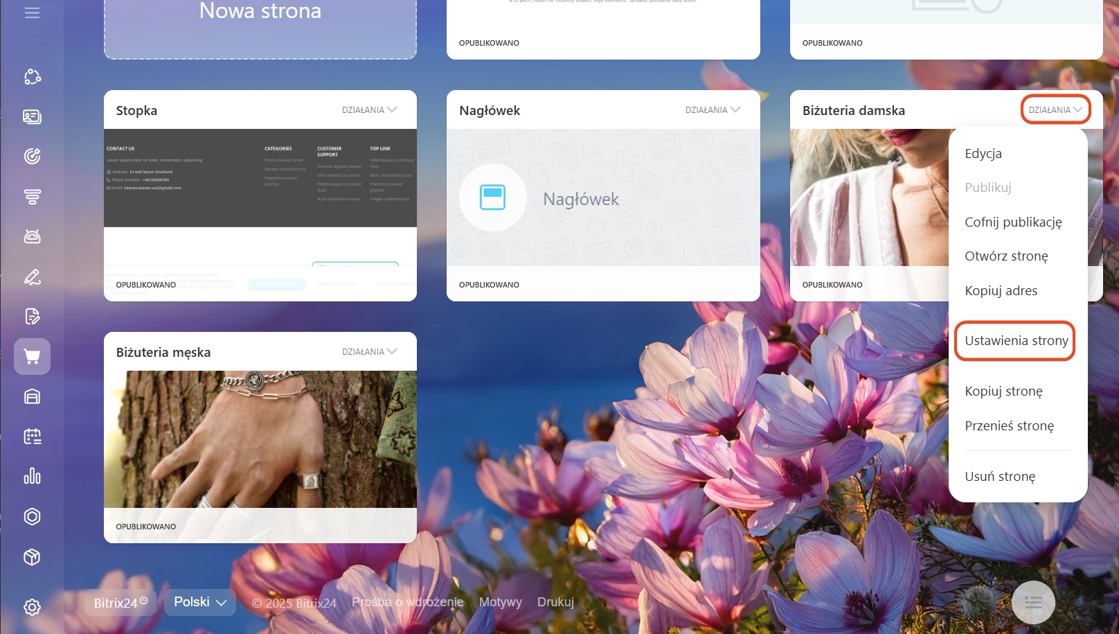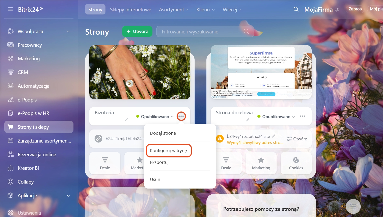 Przejdź do strony Strony i sklepy w swoim koncie Bitrix24 i wybierz Konfiguruj witrynę w menu akcji strony.