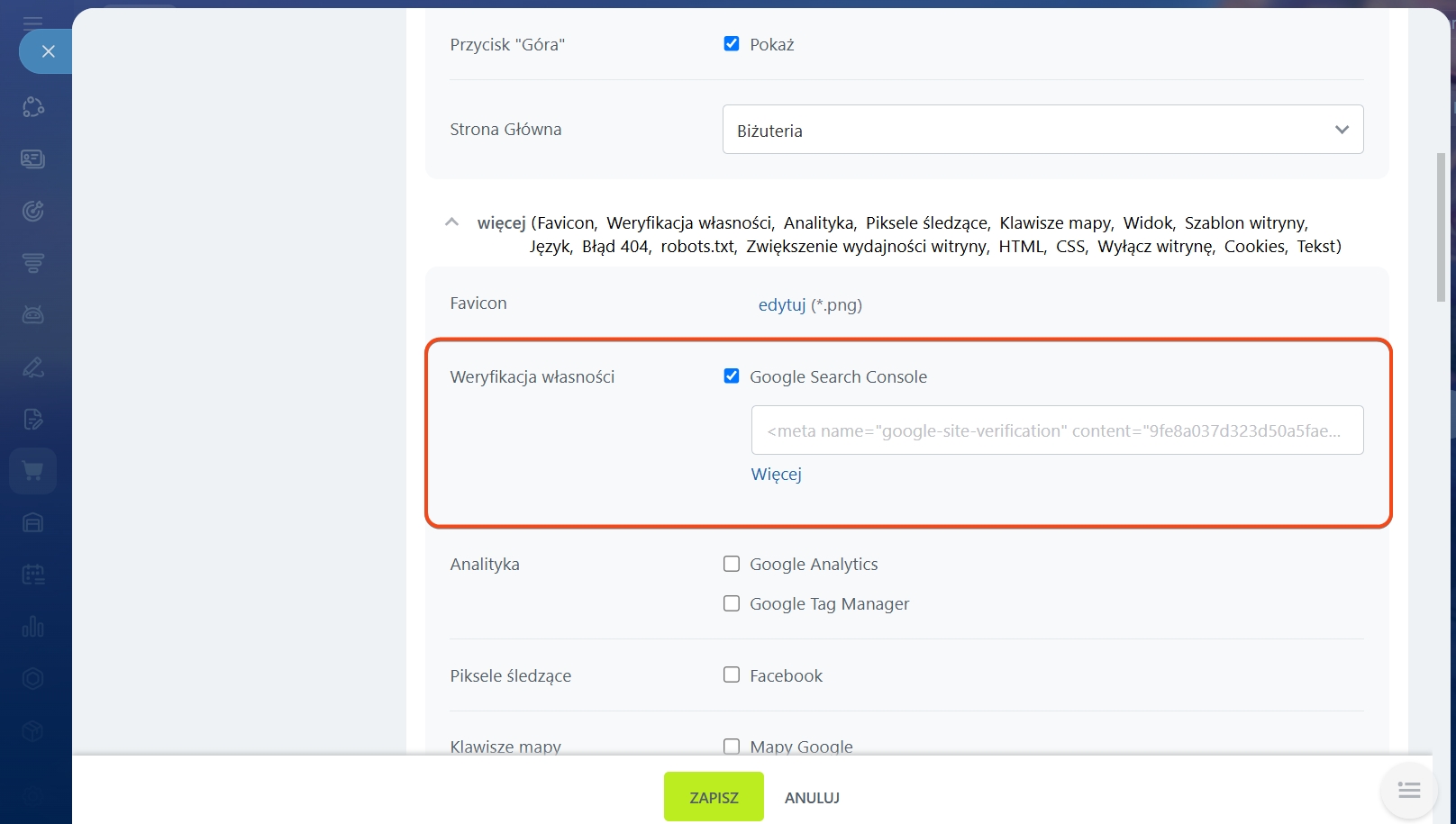 W sekcji Weryfikacja własności włącz opcję Google Search Console i wklej meta tag w odpowiednie pole. Kliknij Zapisz.