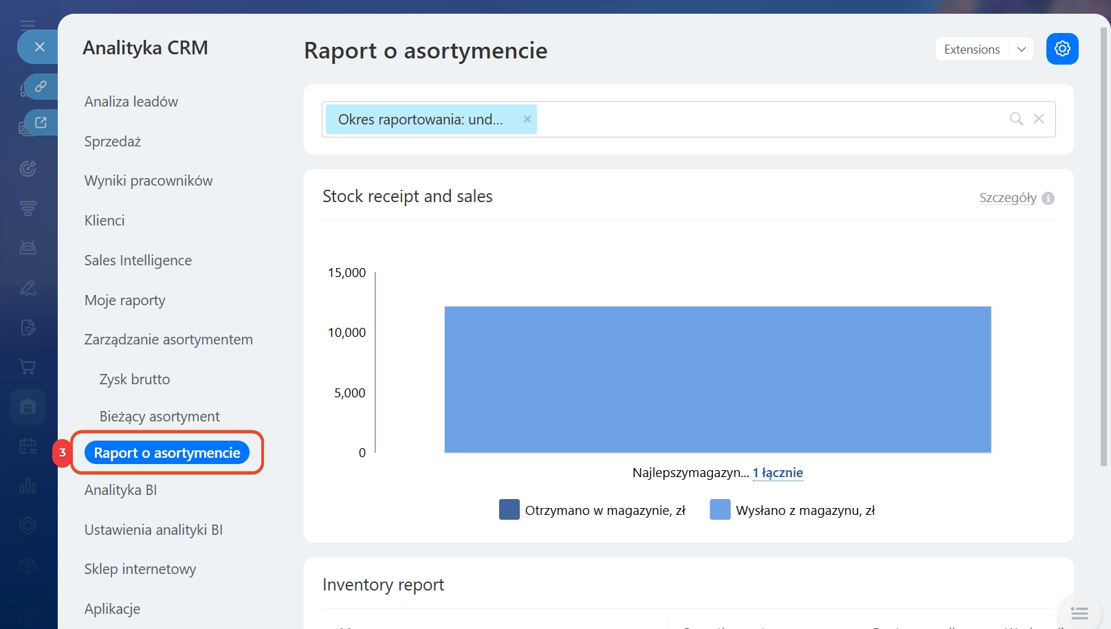 - Raport pokazuje, ile produktów dostarczono i sprzedano w wybranym okresie.