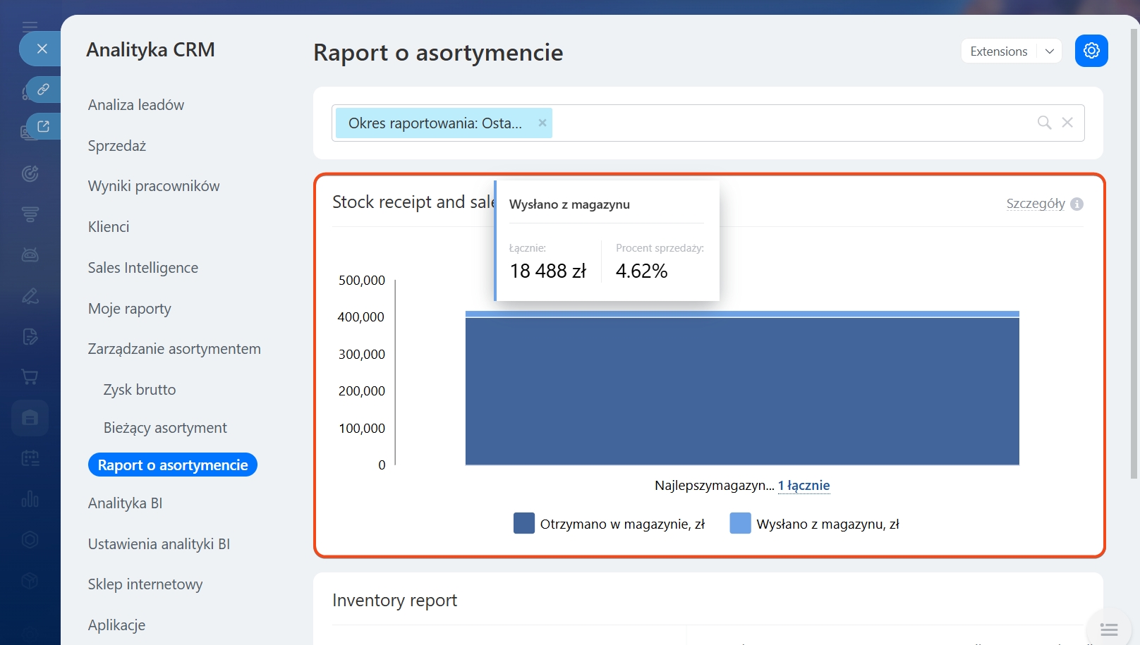 Raport pomaga monitorować rotację zapasów: możesz zobaczyć, ile dostarczono, ile sprzedano i jak zmieniał się stan magazynowy w danym okresie. Dzięki temu możesz na czas zamówić, przenieść produkty lub wstrzymać dostawy.