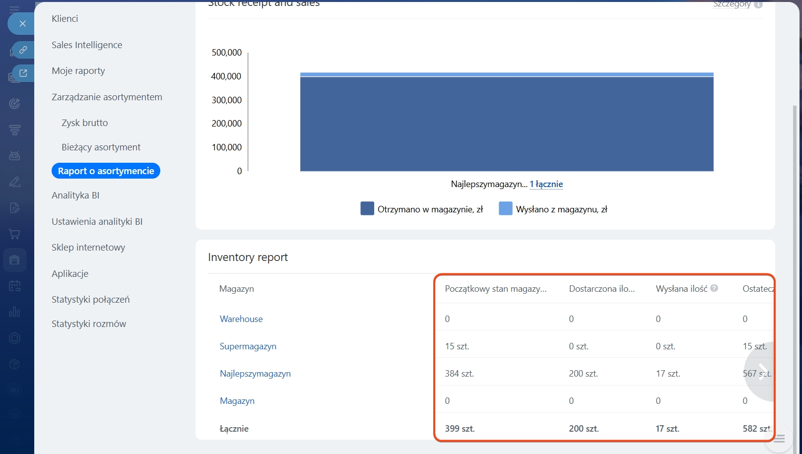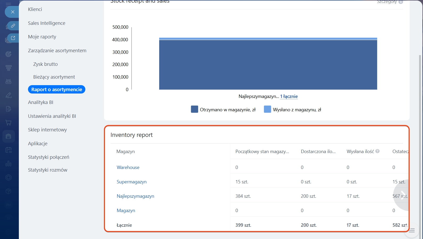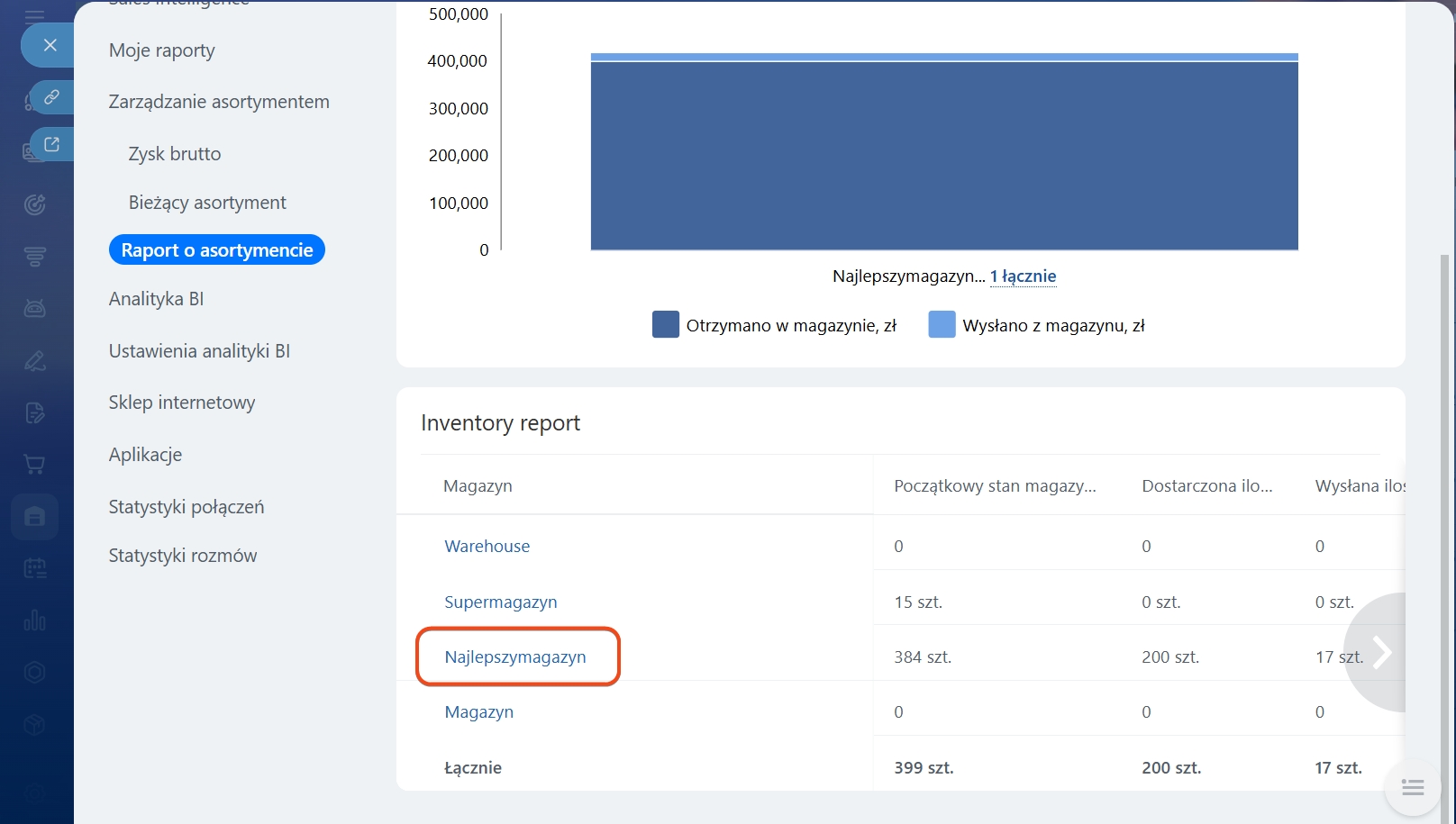 Dla każdego magazynu możesz zobaczyć szczegółowe informacje z podziałem na produkty. Kliknij nazwę magazynu, a otworzy się tabela z zapasami, przyjęciami i sprzedażą za okres. Te dane pomogą określić, które produkty sprzedają się szybko, a które wolno, i podjąć decyzję: uzupełnić zapasy, przenieść nadwyżki lub zorganizować wyprzedaż.