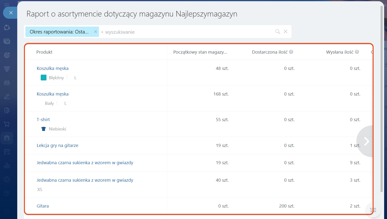 - Początkowy stan — ile produktów było na magazynie na początku wybranego okresu.