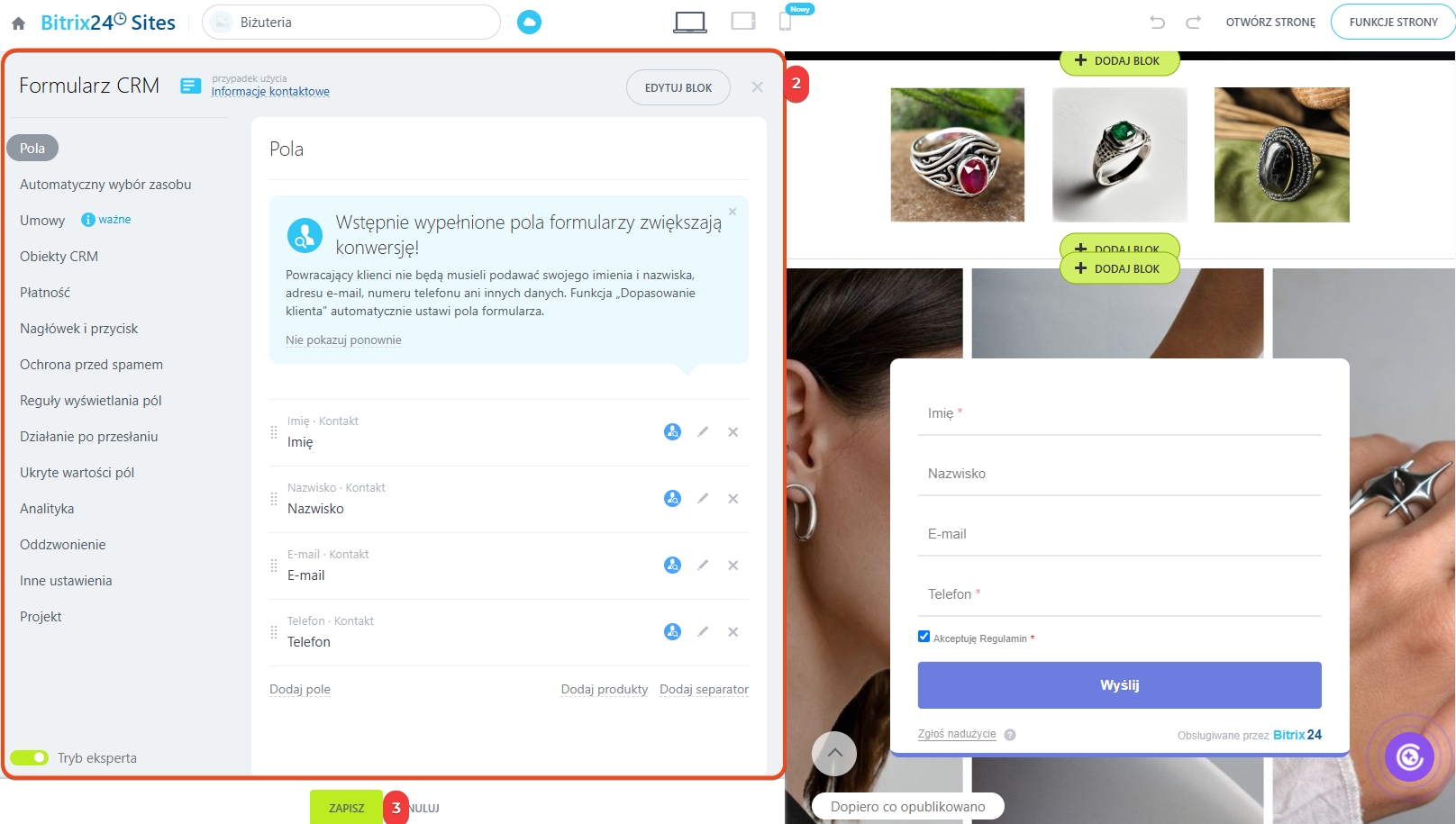 - Formularze CRM pomagają zbierać zgłoszenia, kontakty i opinie klientów. Na stronie można je umieścić w osobnym bloku lub widżecie.