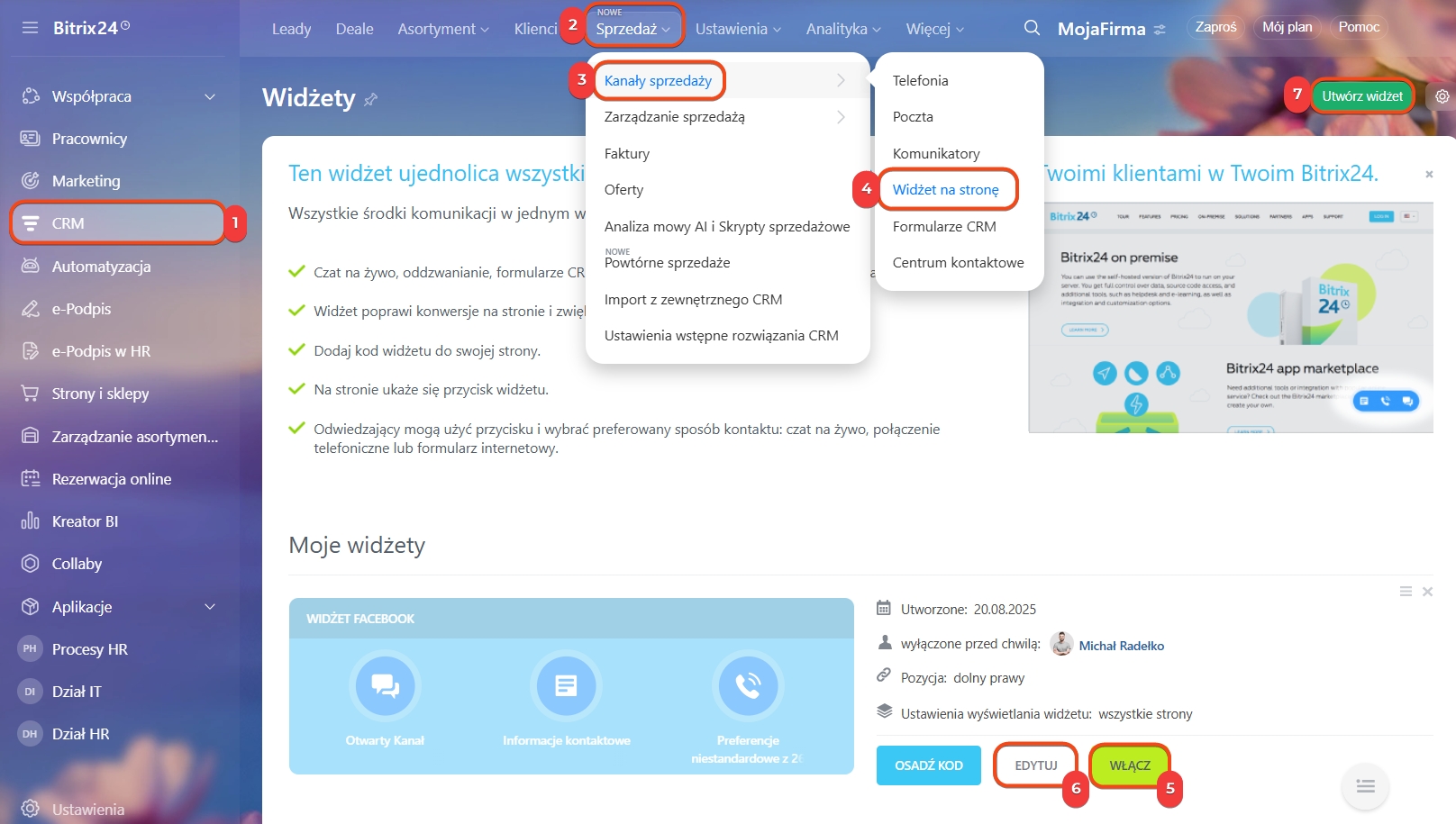 1–4. Przejdź do sekcji CRM > Sprzedaż > Kanały sprzedaży > Widżet na stronę.