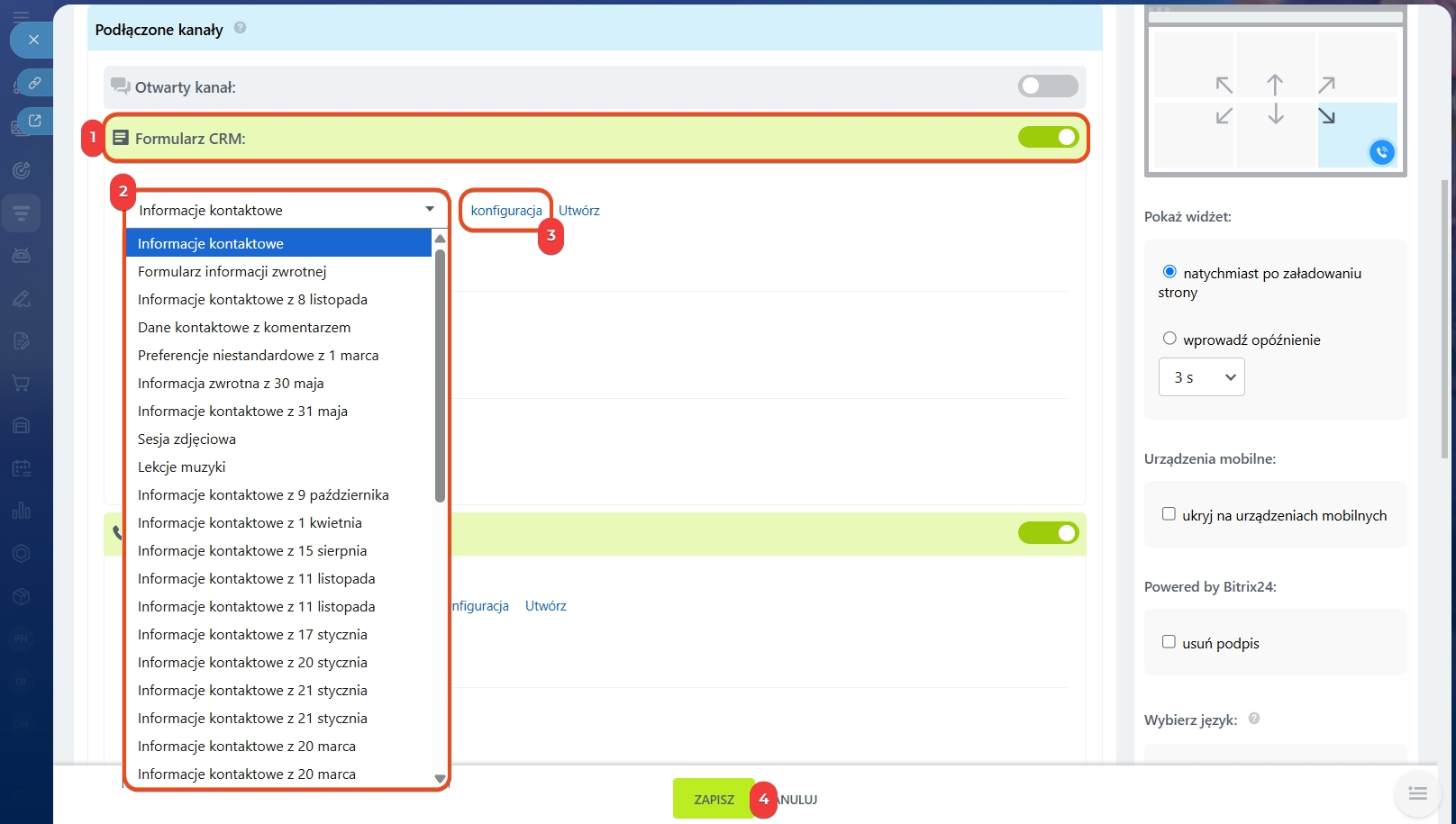 1–2. Włącz kanał Formularz CRM i wybierz odpowiedni formularz z listy.