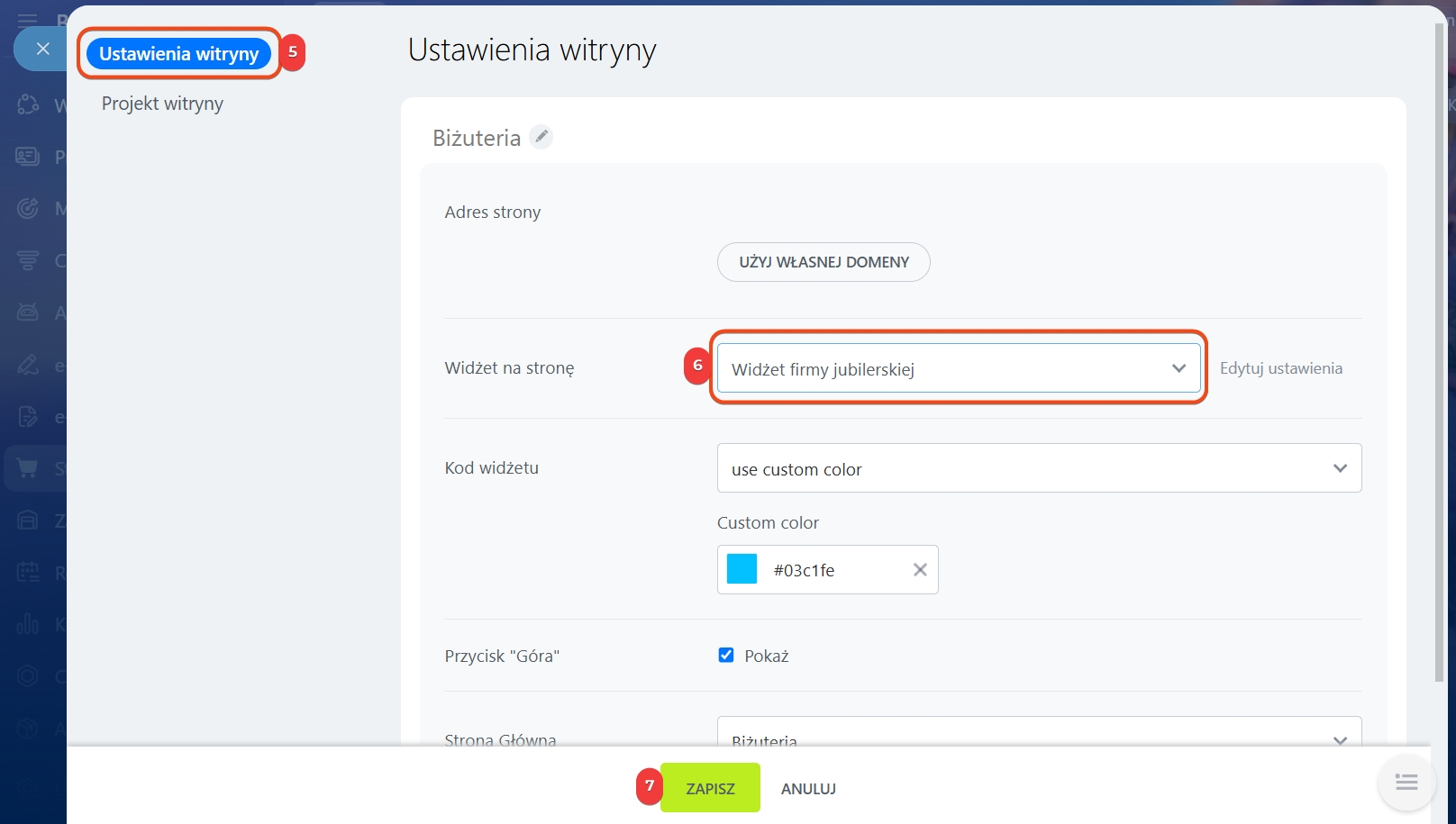 5–6. W sekcji Ustawienia witryny wybierz z listy widżet z formularzem CRM.