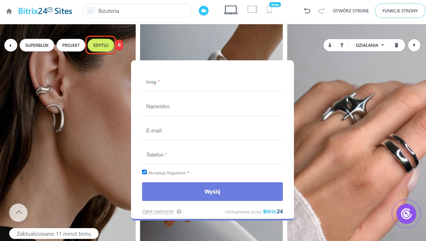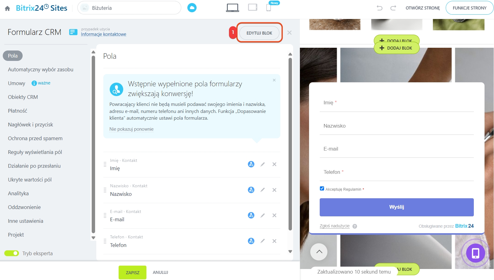 Można umieszczać tylko aktywne formularze kontaktowe CRM. Edytować stronę mogą pracownicy, którzy mają prawo do zmiany treści.