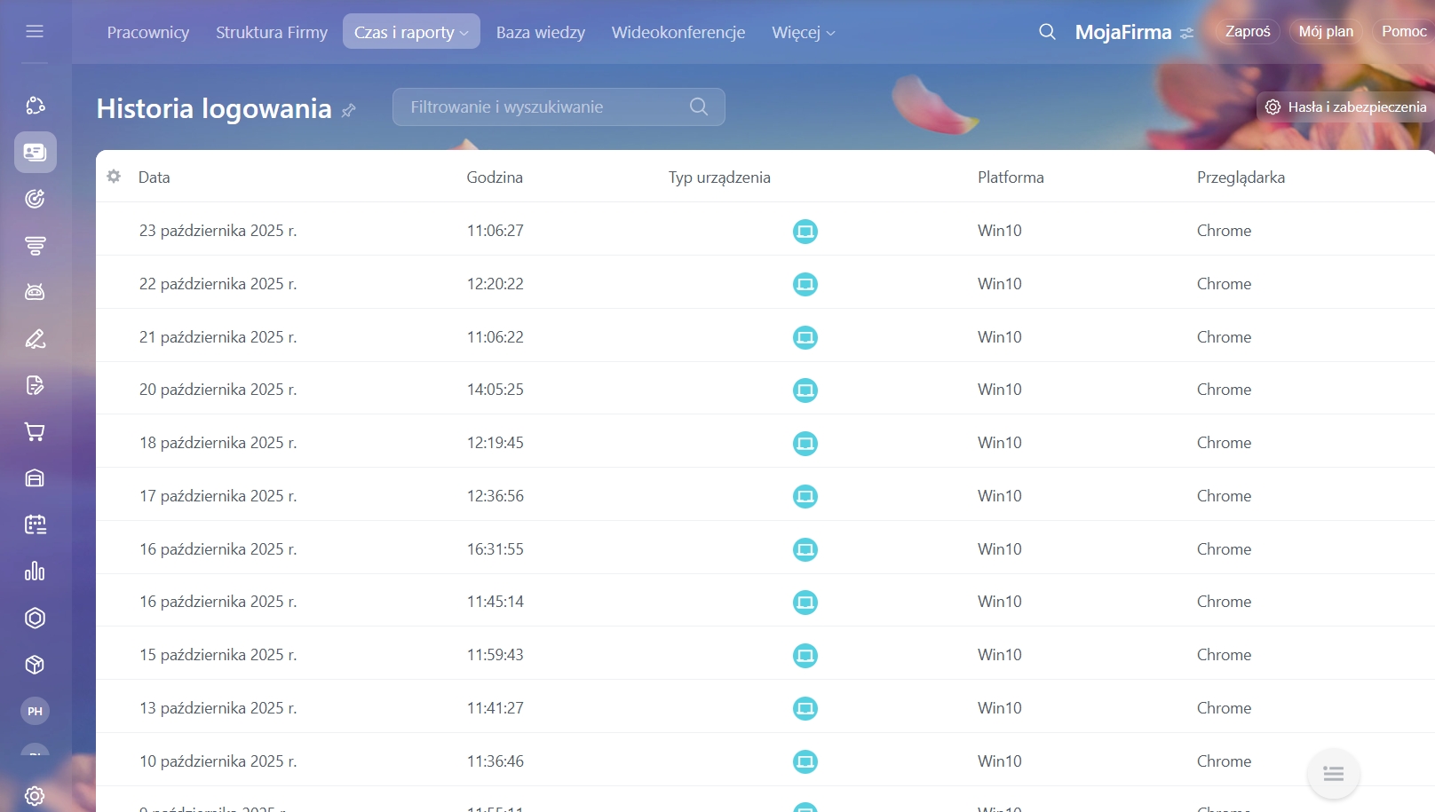 - Pracownicy mogą zobaczyć jedynie swoją historię logowań w profilu osobistym.