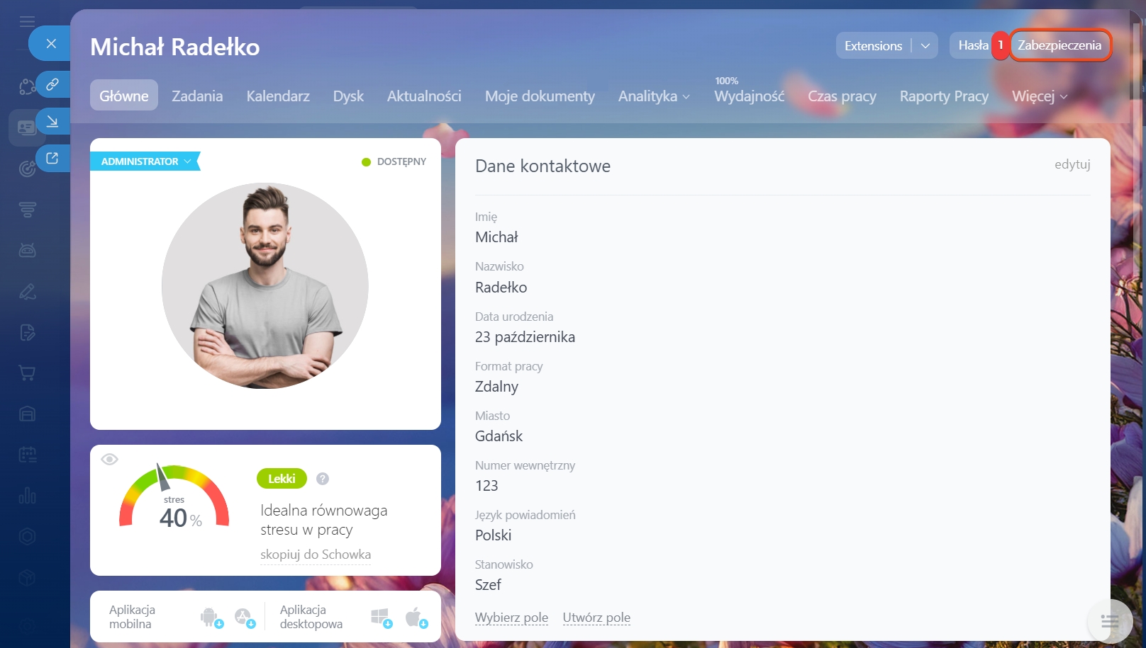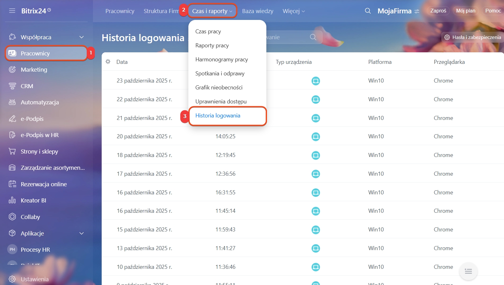 W Bitrix24 można śledzić historię logowań pracowników. Administrator ma dostęp do historii logowań wszystkich użytkowników. Pracownicy mogą zobaczyć jedynie swoją historię logowań.