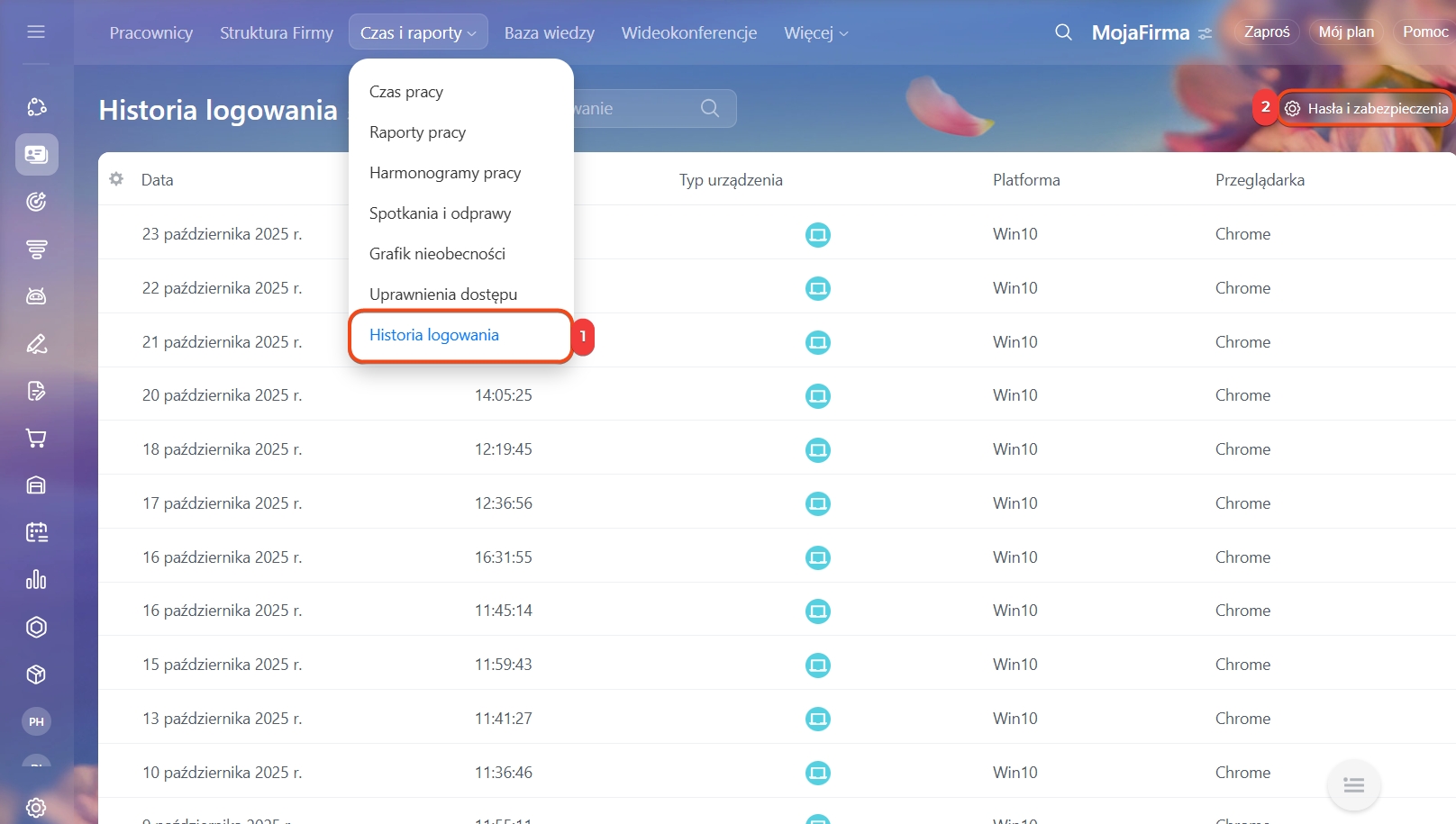 Przejdź do sekcji Pracownicy > Czas i raporty > Historia logowań.