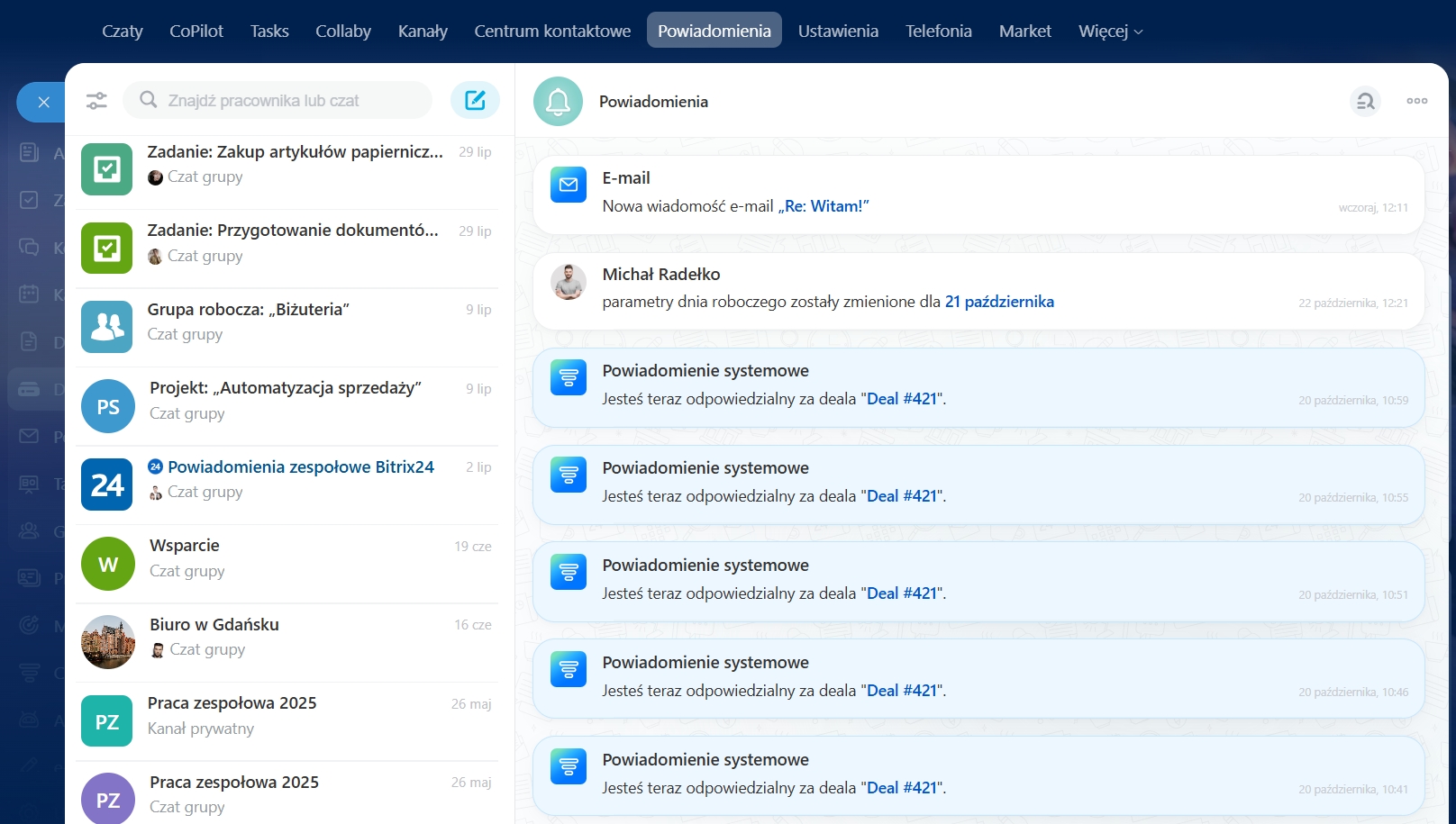 - Wersja webowa i aplikacja desktopowa: powiadomienia pojawią się w Bitrix24 w sekcji Powiadomienia.