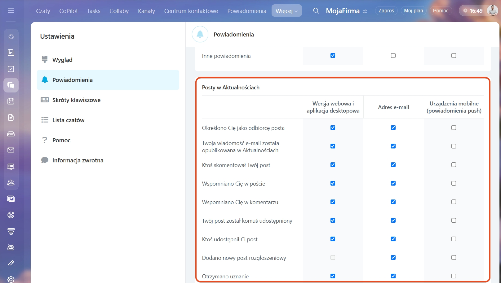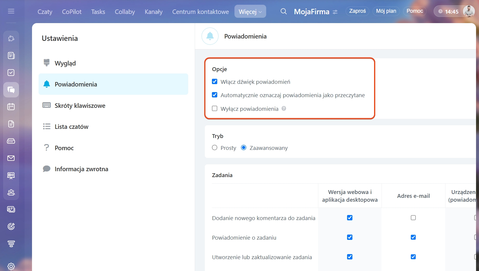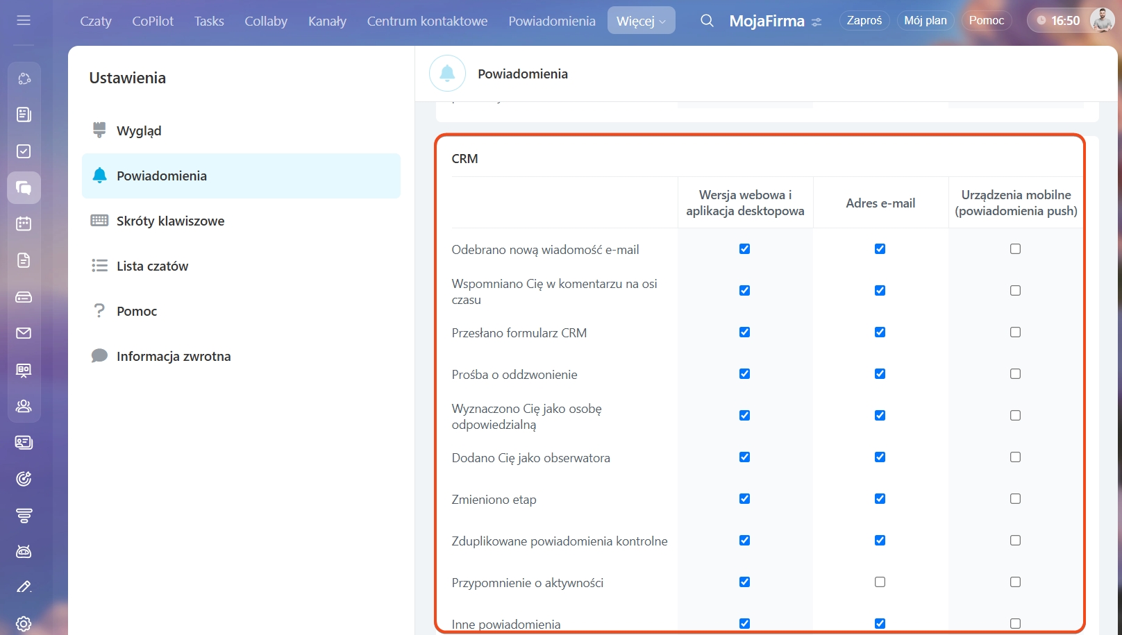 Możesz dostosować powiadomienia do swoich potrzeb — wybrać, jakie wydarzenia chcesz otrzymywać i gdzie je wyświetlać: w komunikatorze, przez wiadomości e-mail lub w aplikacji mobilnej. Na przykład włącz powiadomienia z CRM i wyłącz powiadomienia o zadaniach.