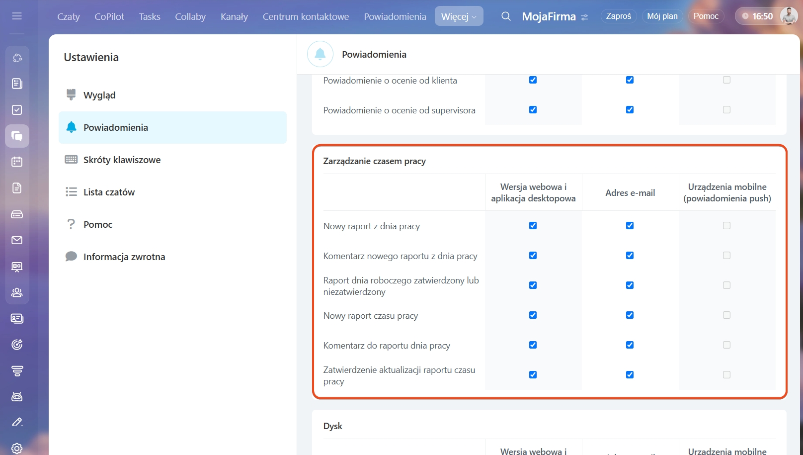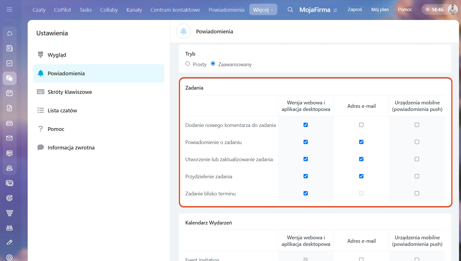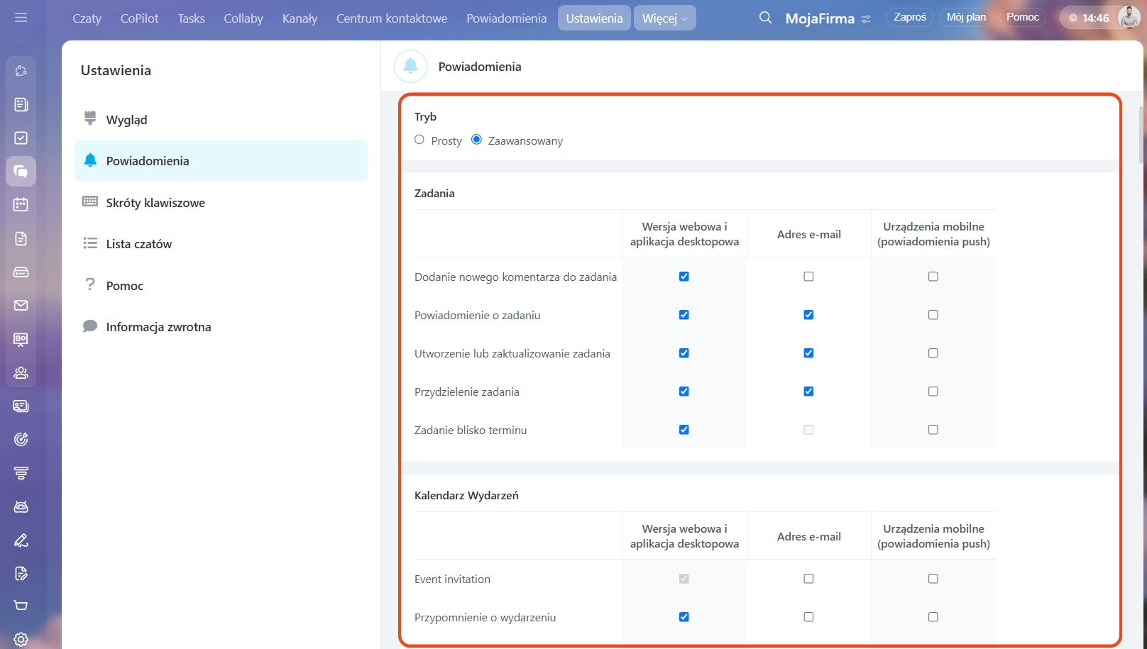 Możesz dostosować powiadomienia do swoich potrzeb — wybrać, jakie wydarzenia chcesz otrzymywać i gdzie je wyświetlać: w komunikatorze, przez wiadomości e-mail lub w aplikacji mobilnej. Na przykład włącz powiadomienia z CRM i wyłącz powiadomienia o zadaniach.