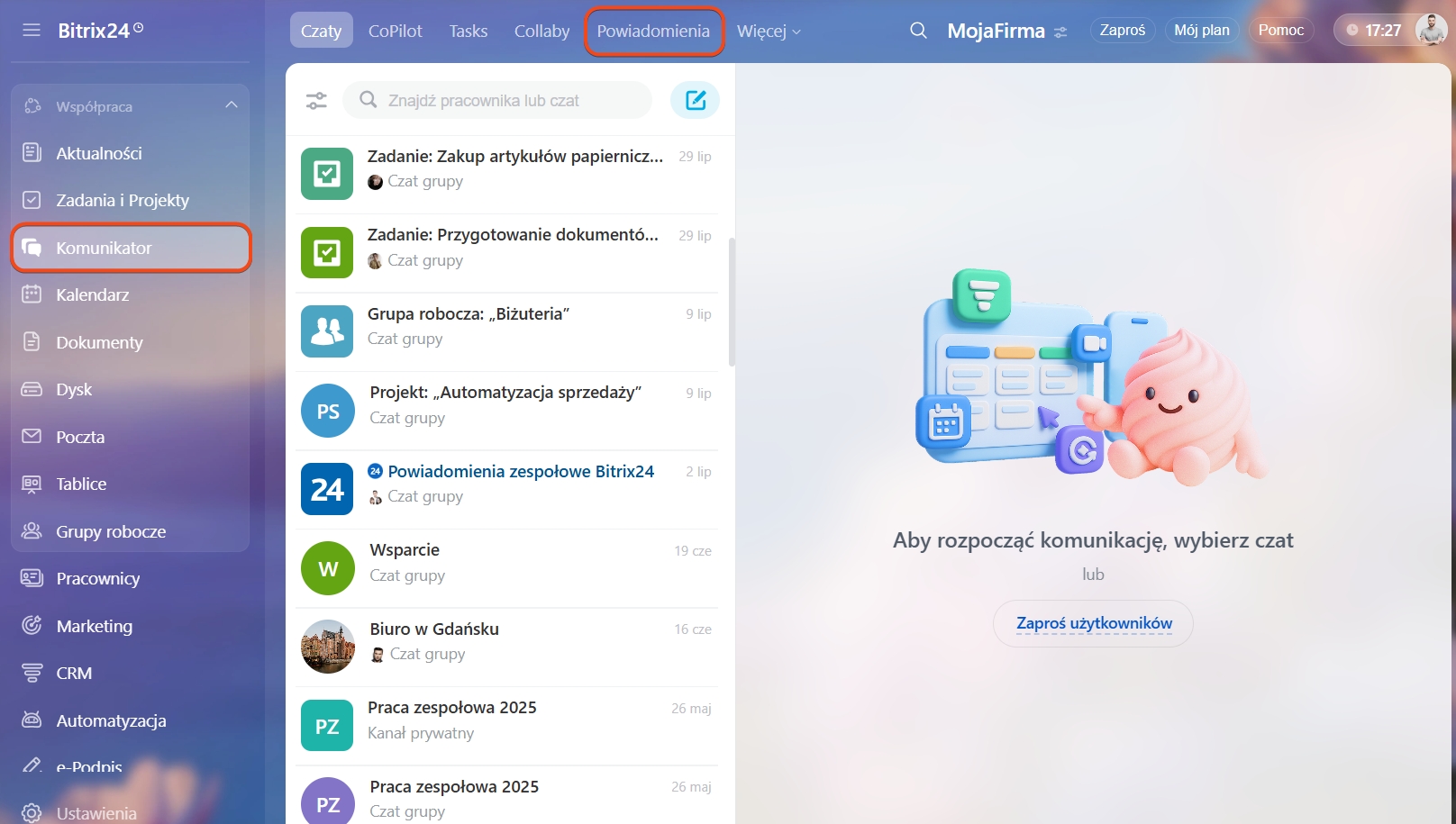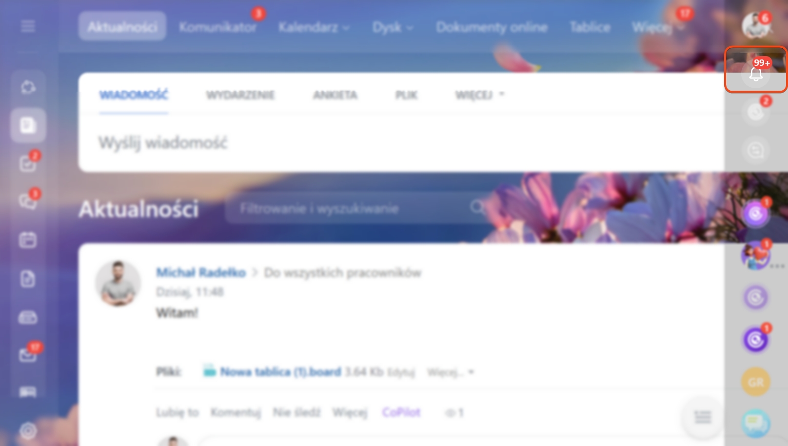 Otwórz listę powiadomień. Kliknij dzwonek w panelu bocznym lub przejdź do sekcji Komunikator > Powiadomienia.