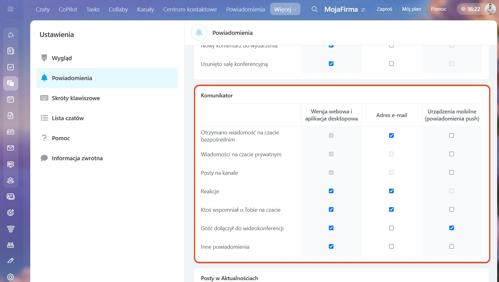Aby otrzymywać tylko potrzebne powiadomienia, dostosuj je do swoich potrzeb. Przejdź do Komunikator > Więcej > Ustawienia > Powiadomienia.