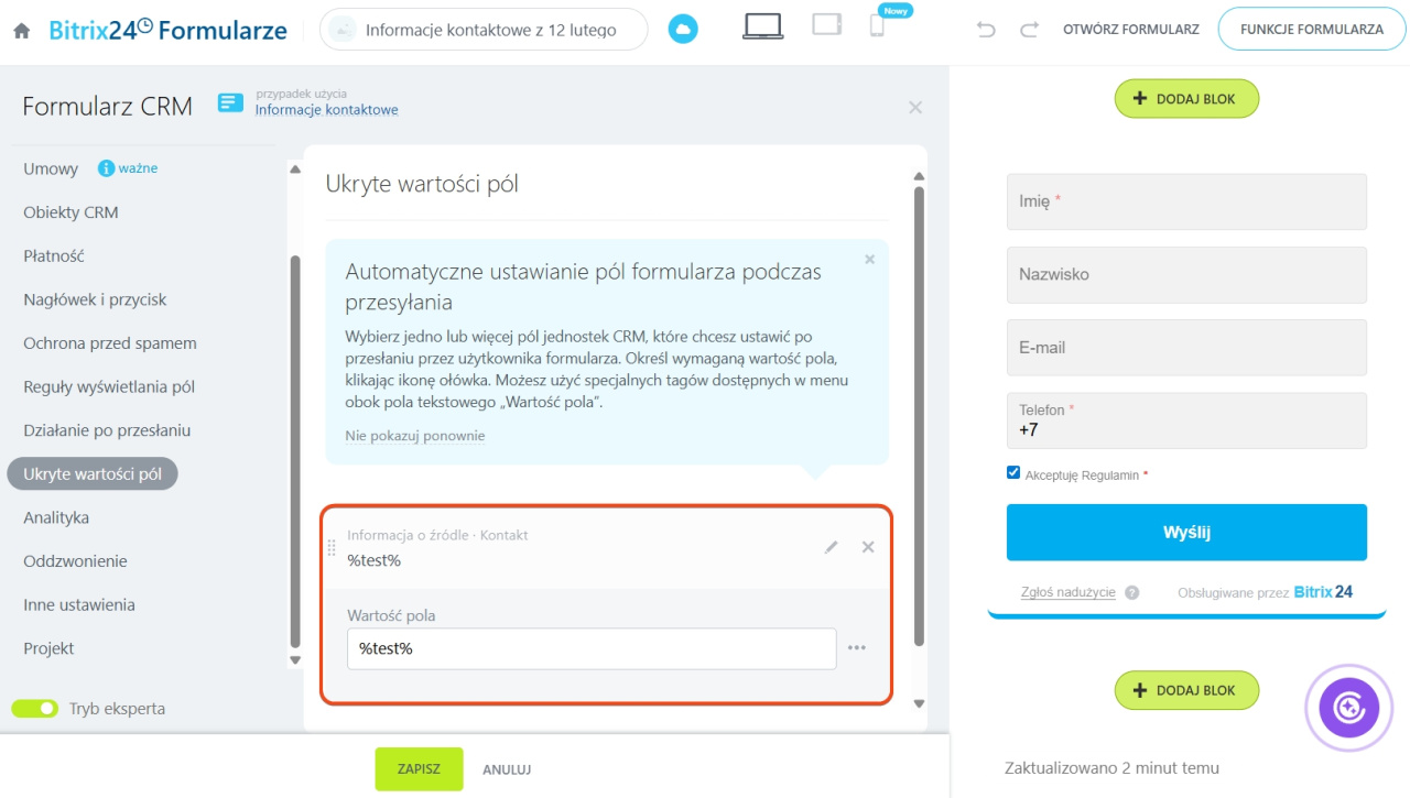 Dodaj pole ukryte do formularzy CRM, które chcesz umieścić na stronie internetowej, i ustaw dla niego wartość. Na przykład: %test%.