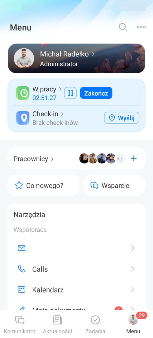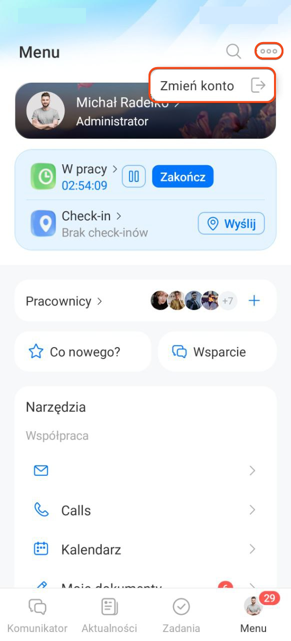 Teraz wszystkie dodatkowe narzędzia są zebrane w menu, które otwiera się po kliknięciu zdjęcia na dole ekranu. Tutaj możesz zarządzać czasem pracy, oznaczać obecność, otwierać profil, dokumenty, ustawienia i szybko przełączać się między kontami.