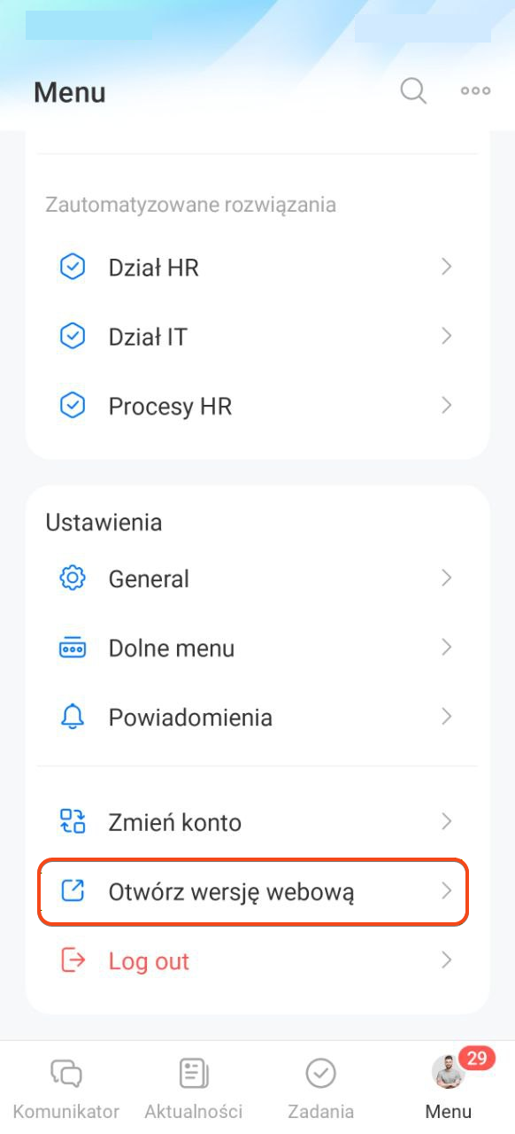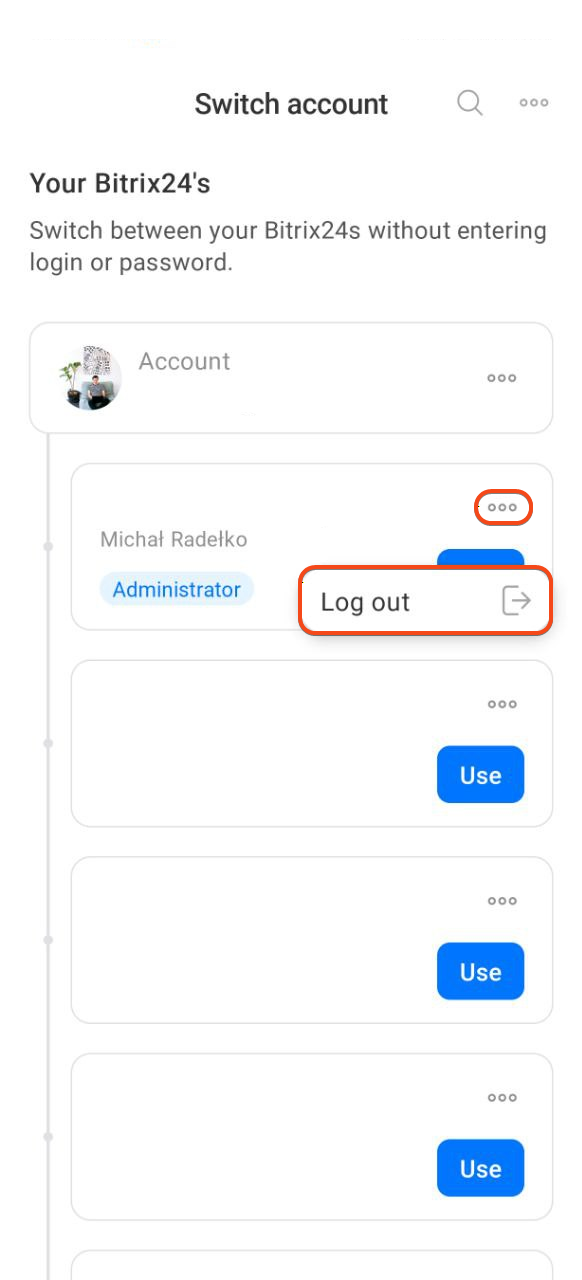 - wylogować się z Bitrix24 — kliknij Trzy kropki > Wyloguj się.
