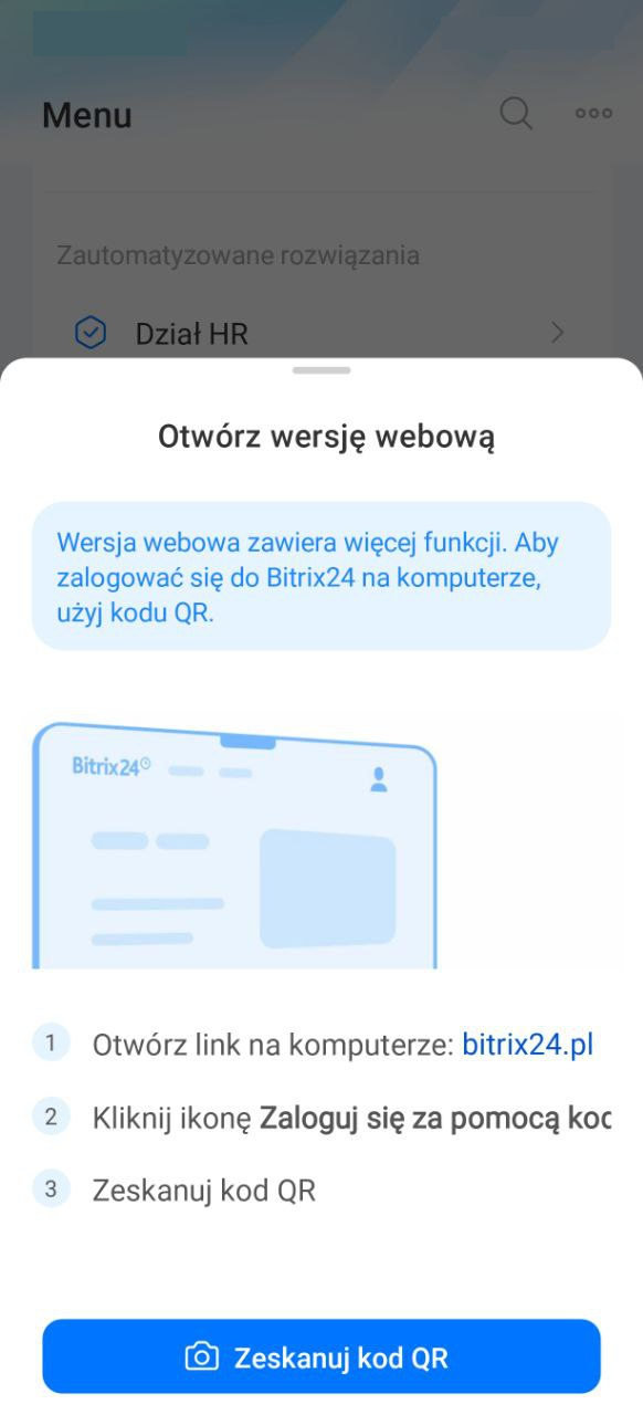 Logowanie z komputera. Możesz szybko przejść z wersji mobilnej do Bitrix24 na komputerze. Nie musisz ręcznie wpisywać loginu i hasła — autoryzacja odbywa się natychmiastowo.