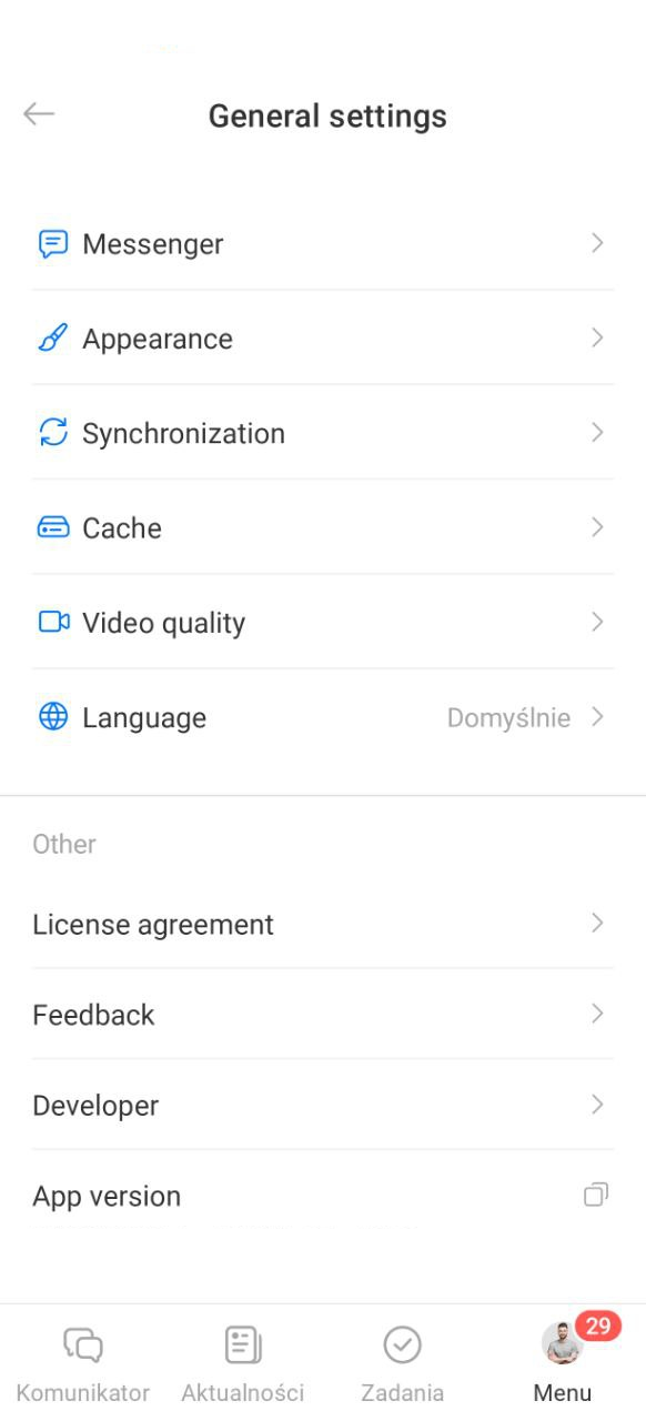 Podstawowe ustawienia. Tutaj możesz dostosować aplikację mobilną Bitrix24: zmienić motyw aplikacji, dostosować czat, zsynchronizować kontakty i kalendarze, wybrać język aplikacji.