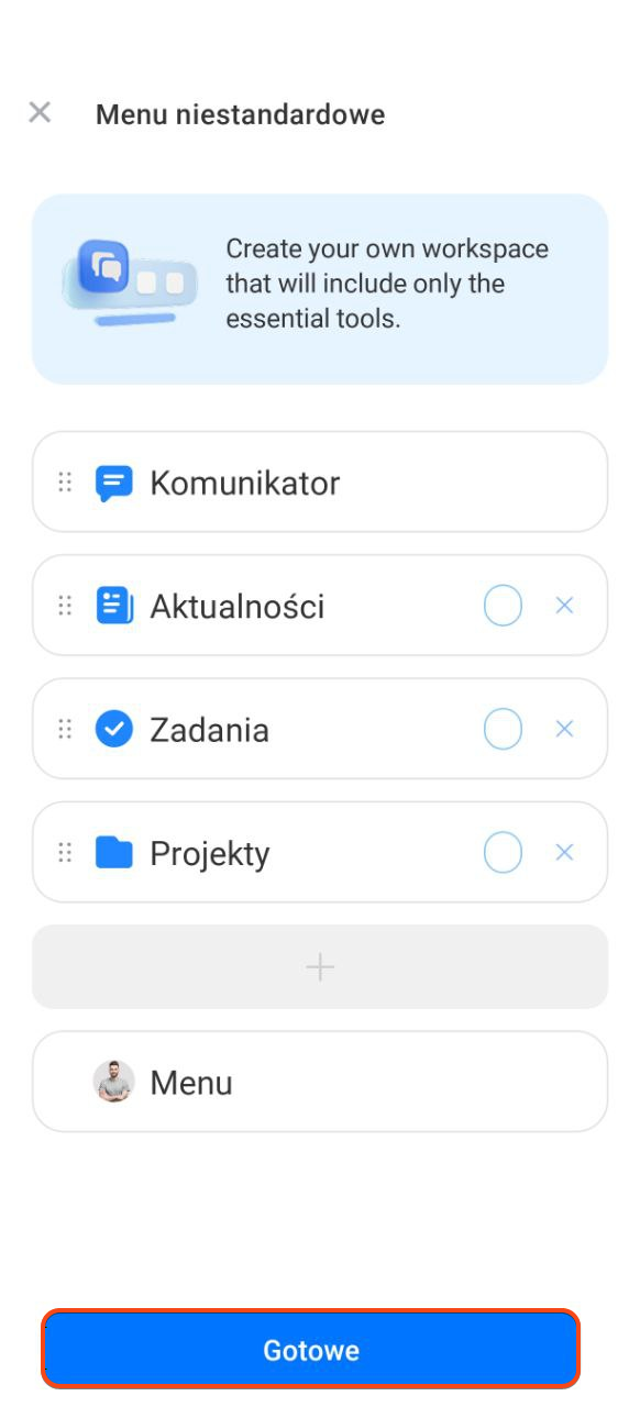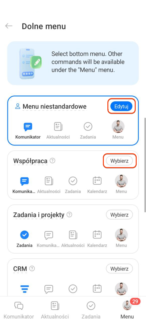 Możesz wybrać gotowe menu lub stworzyć własne. Na przykład, jeśli codziennie omawiasz kwestie robocze na czatach i śledzisz aktualności w Aktualności, wybierz menu Współpraca.