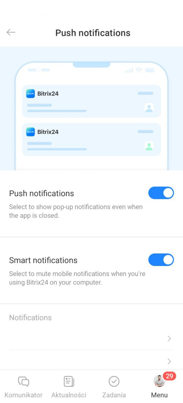 Powiadomienia. Skonfiguruj, jakie powiadomienia chcesz otrzymywać w aplikacji mobilnej. Na przykład włącz Tryb inteligentny, aby nie otrzymywać powiadomień na telefon, jeśli pracujesz w Bitrix24 na komputerze.